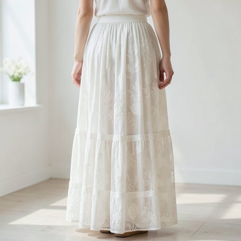Ethereal Whites White maxi skirts are timeless, offering a clean canvas that exudes purity and elegance. With delicate lace detailing, they are a nod to bohemian romance.