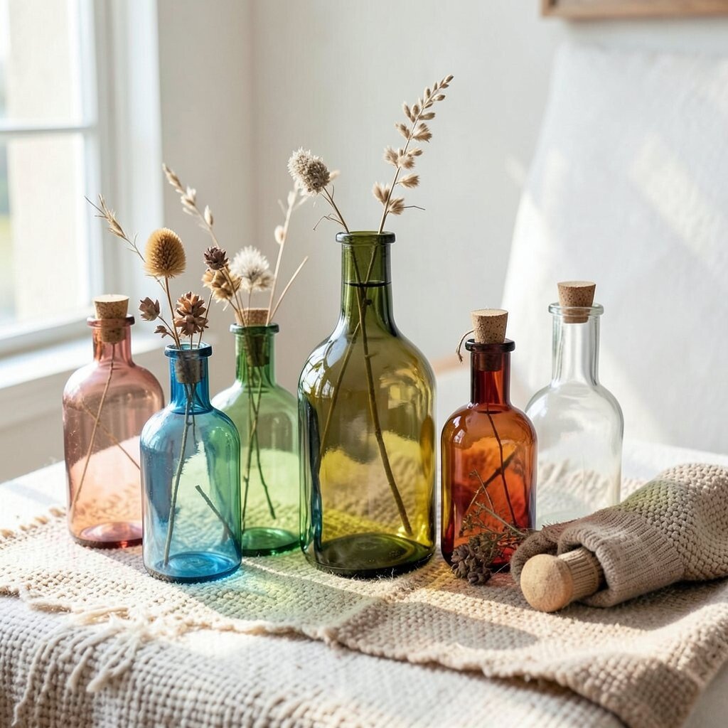 Colorful glass bottles can be used as vases, candle holders, or simple decorative pieces. Their vibrant colors catch the light beautifully, adding a playful element to your decor.
