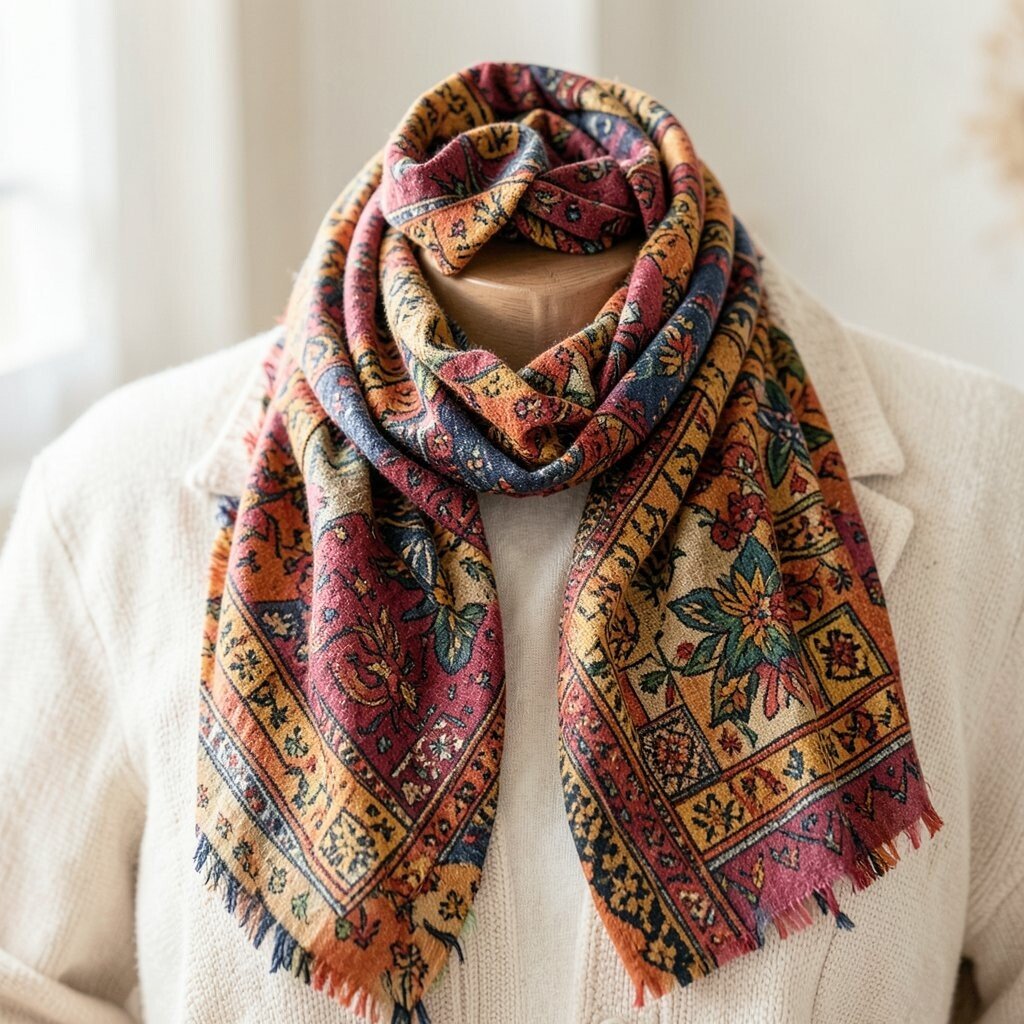 Scarves with ethnic prints add color and texture to outfits. They can be worn in multiple ways, making them versatile accessories. Use them as headbands, belts, or to adorn bags.