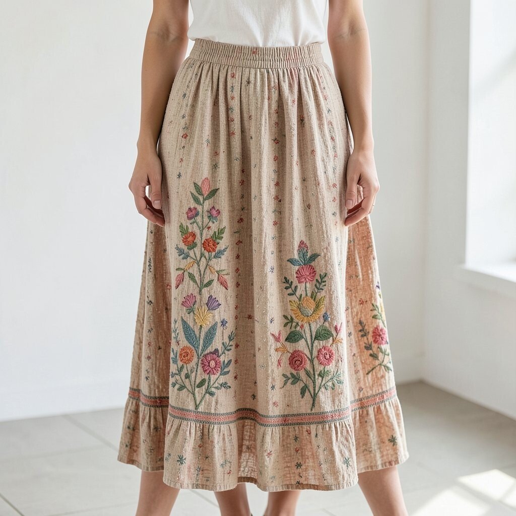 An embroidered skirt brings a touch of elegance to boho fashion. The intricate stitching elevates the overall look.