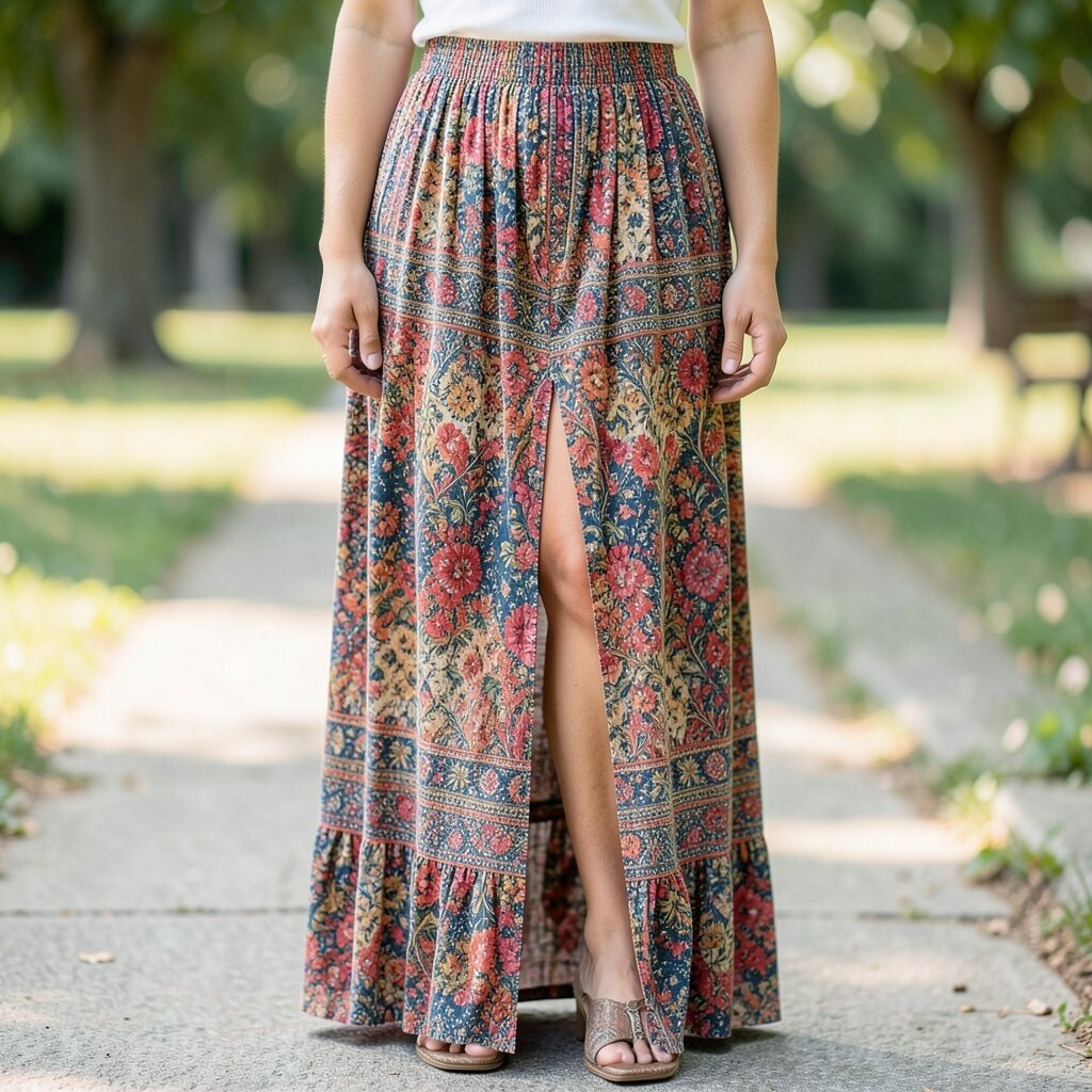 Maxi skirts with slits combine comfort with a hint of allure. The slit adds a modern twist to the classic boho skirt.
