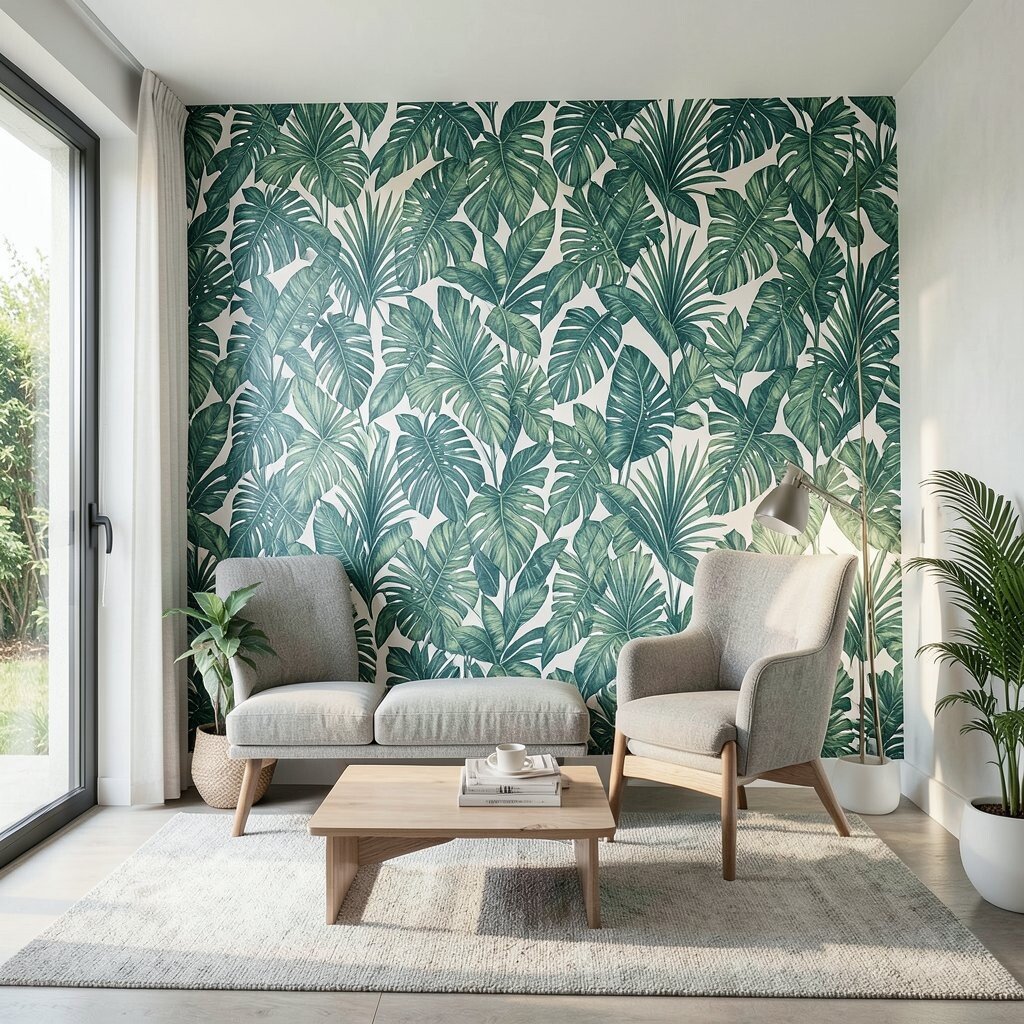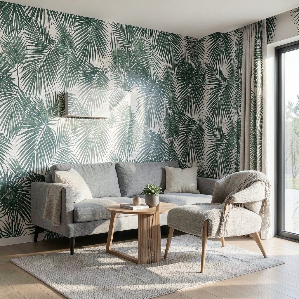 Many current interiors use palm prints with pale sand colors, soft green, and warm wood. That mix feels relaxed and modern. If you want the room to feel more unique, choose a palm design with painterly lines or a dark background.