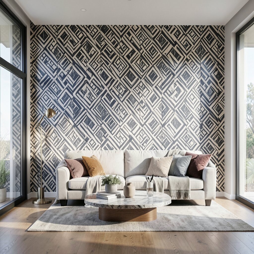 Oversized geometric wallpaper makes a room feel sharp, fresh, and full of motion. Big shapes on the wall can turn a plain space into a strong focal point without needing much else.