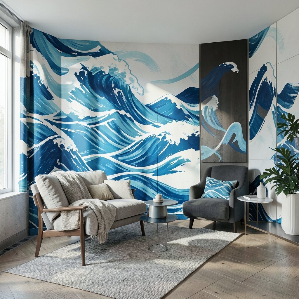 This look works well on walls, furniture, and art pieces. It can be subtle in pale shades or bold in deep blues and greens. A painted wave mural can be a low-cost way to make a big visual change without buying much decor.