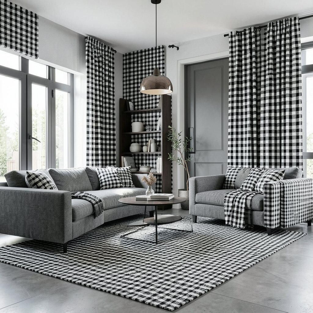 It also works well in kitchens and mudrooms because the bold contrast can hide small marks better than light plain surfaces. A smaller check can feel more gentle, while a large check makes a louder statement. For a personal touch, mix in black frames, white ceramics, or a striped pillow.