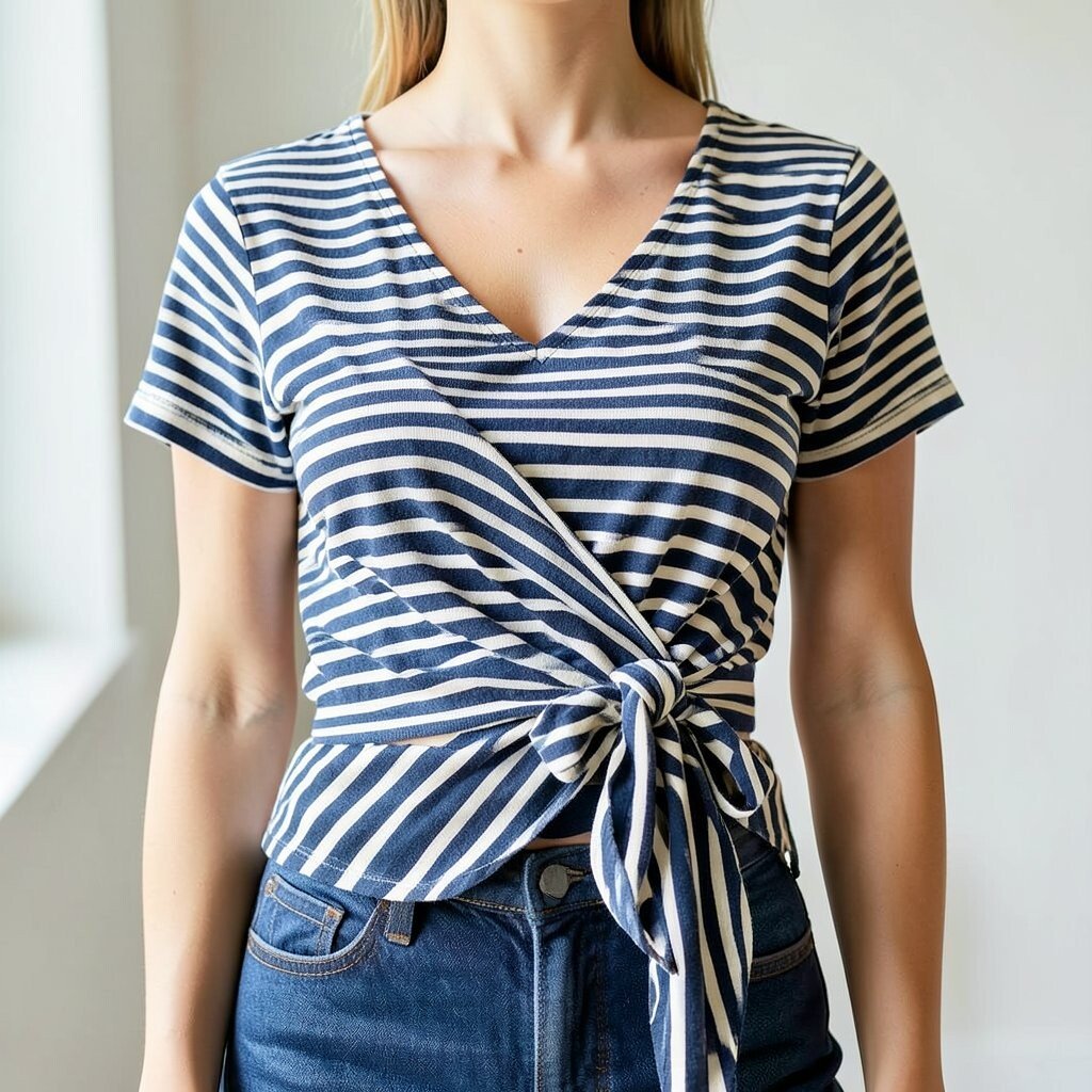 Striped wrap tops give a soft shape that flatters the waist. The wrap style adds a little movement, while the stripes keep the look lively.