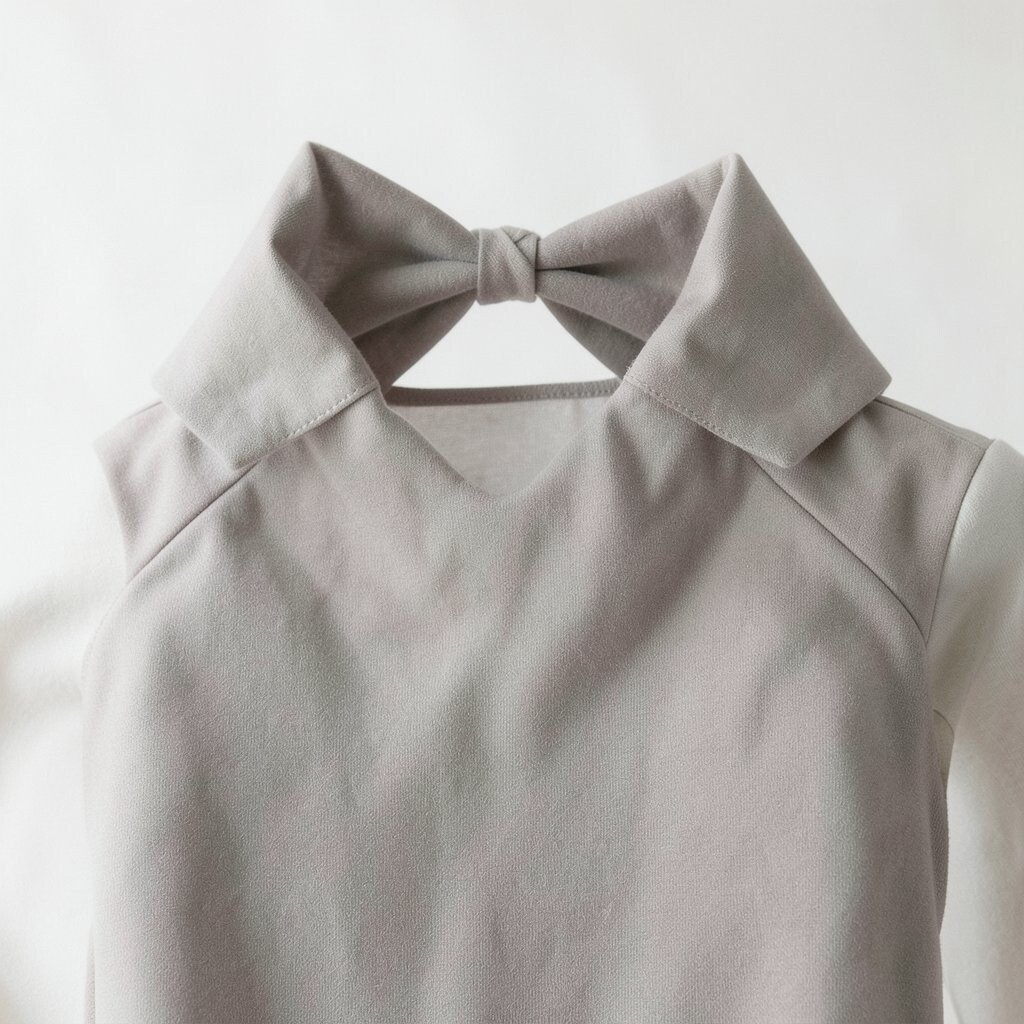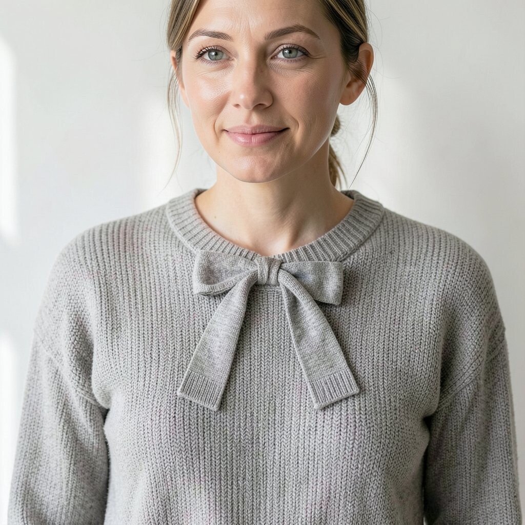 The bow tie neck sweater effortlessly combines comfort with style. This cozy piece features a charming bow that ties at the neck.