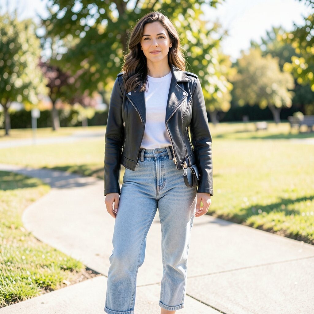 For a bit of edge, pair your favorite leather jacket with a plain tee and skinny jeans. Add ankle boots and a bold lip color to complete the look. A crossbody bag adds functionality and style.
