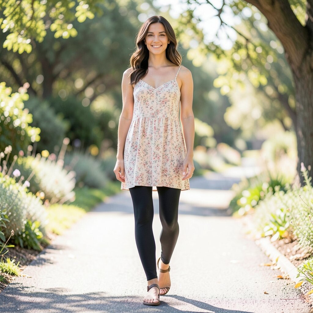 This outfit is perfect for a day at home or a casual outing. Tunics are versatile and can be dressed up or down. Look for budget-friendly options in any clothing store.