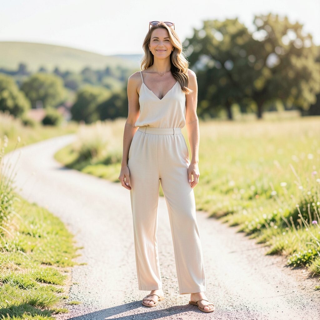 Linen is both comfortable and stylish, ideal for warm weather. This outfit is perfect for a market day or a casual lunch. Linen pieces are available in most fashion stores at various price points.