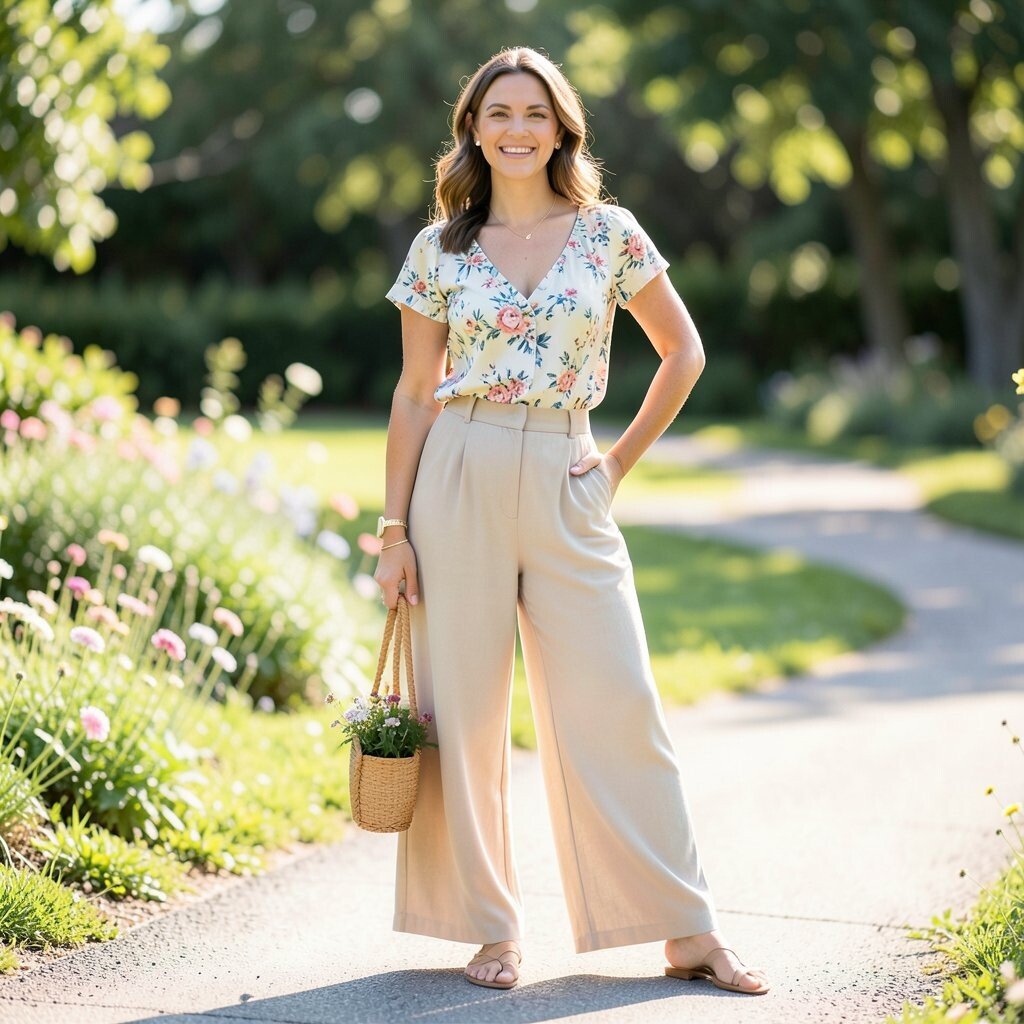 This outfit is perfect for a day at the flea market or a casual lunch. Palazzo pants are flattering and easy to wear, making them a great addition to your wardrobe. Look for unique prints in stores or online.