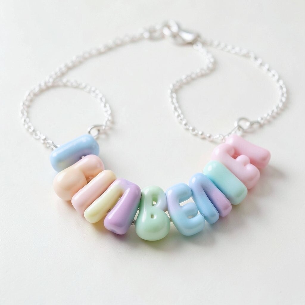 Pastel bubble letters bring a soft and dreamy vibe to your jewelry collection. These colors are gentle and soothing.