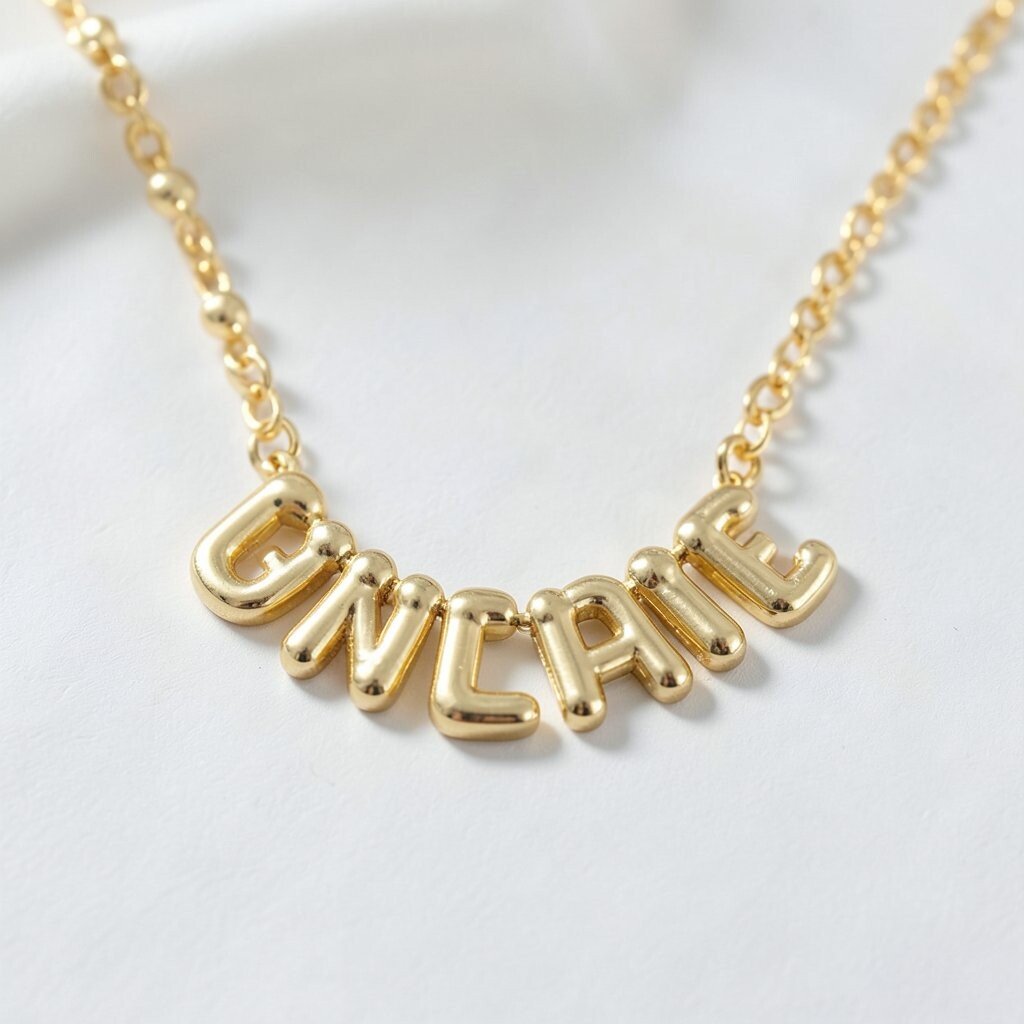 Imagine a necklace that captures the glow of the sun with each movement. Classic gold bubble letters offer a warm and timeless appeal.