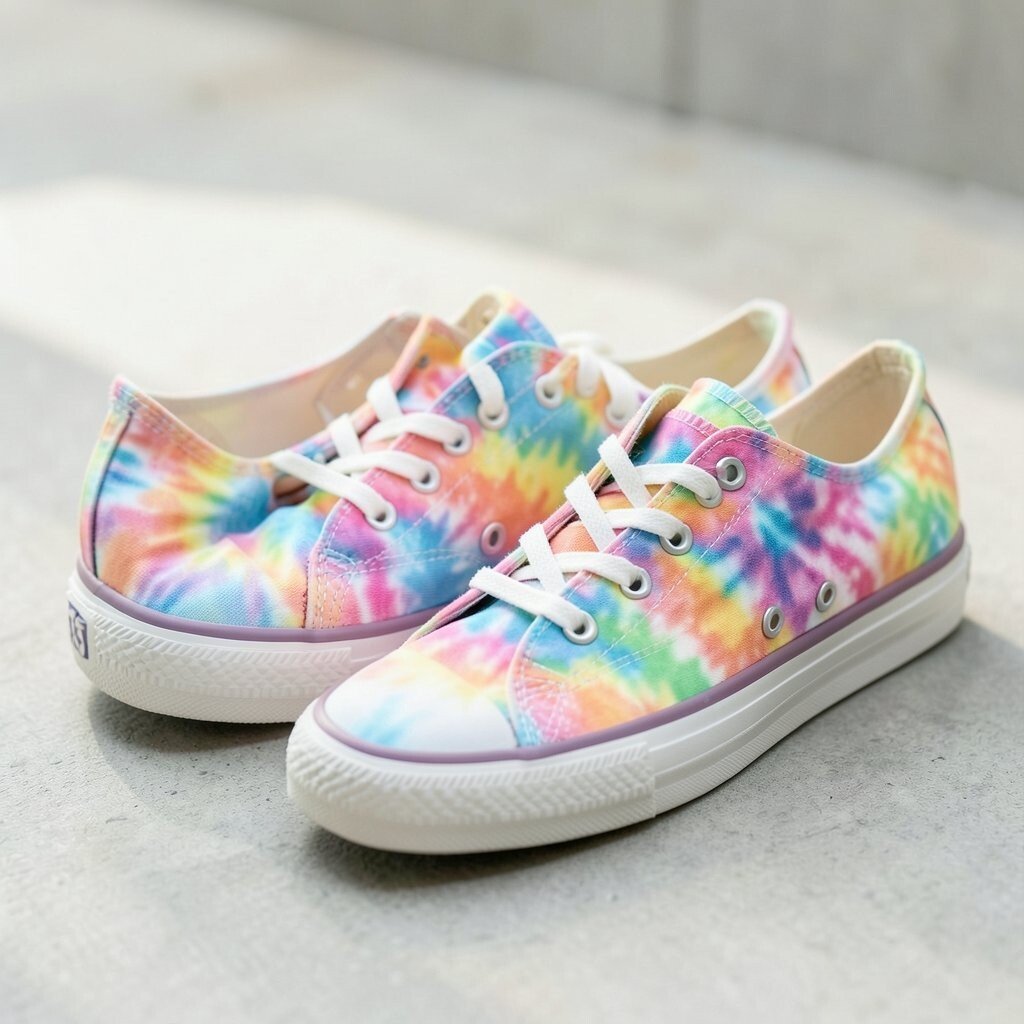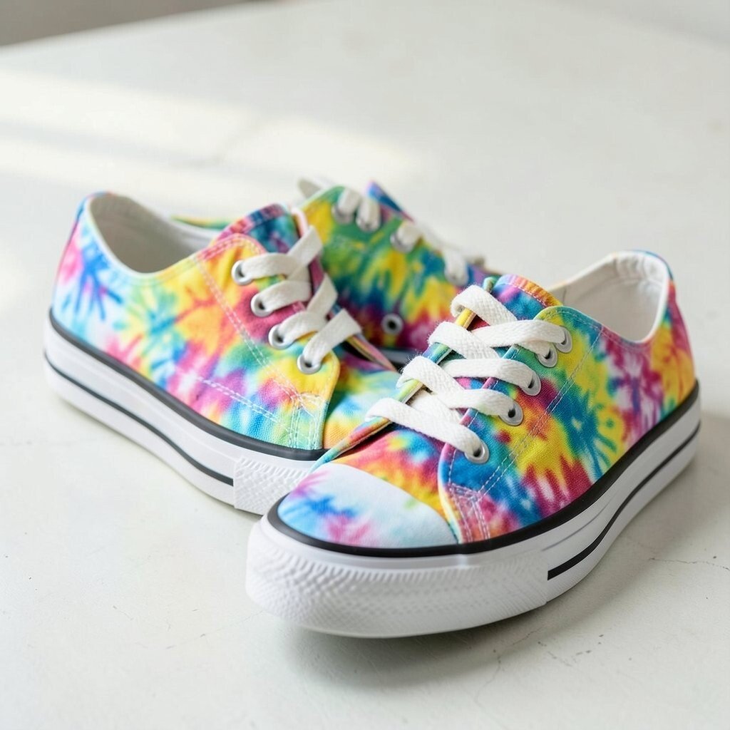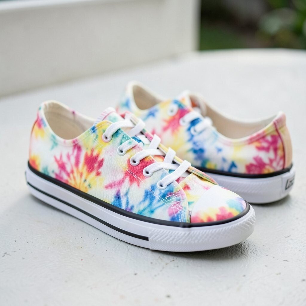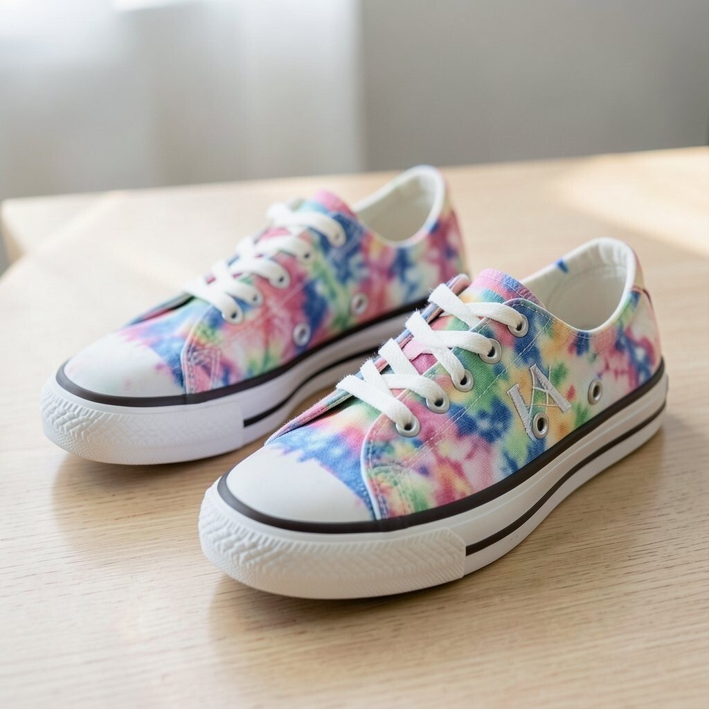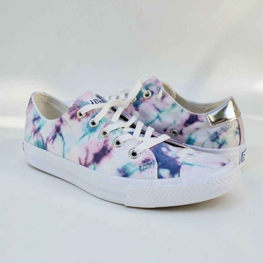 Metallic accents add a shiny touch to tie-dye canvas sneakers, making them feel a little dressier. The mix of soft fabric and sparkle creates a fun contrast.