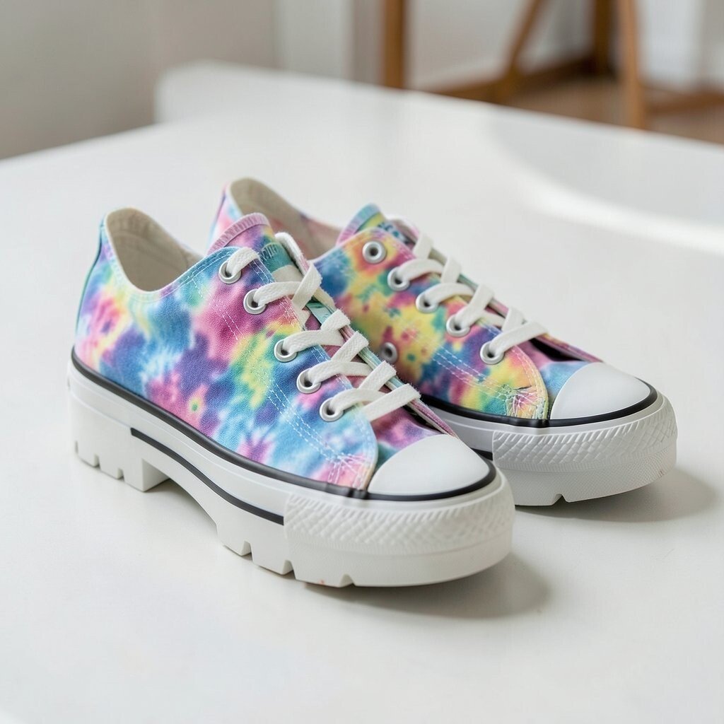 Chunky sole tie-dye sneakers mix a thick base with colorful canvas, creating a bold shape and a playful print. The bigger sole gives extra height and a strong fashion look.