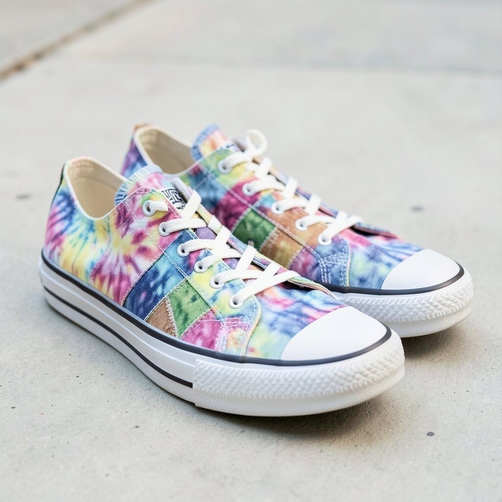 Patchwork panel sneakers mix different fabric sections with tie-dye color, so the shoes look creative and layered. The patchwork can make each pair feel like a little art project.