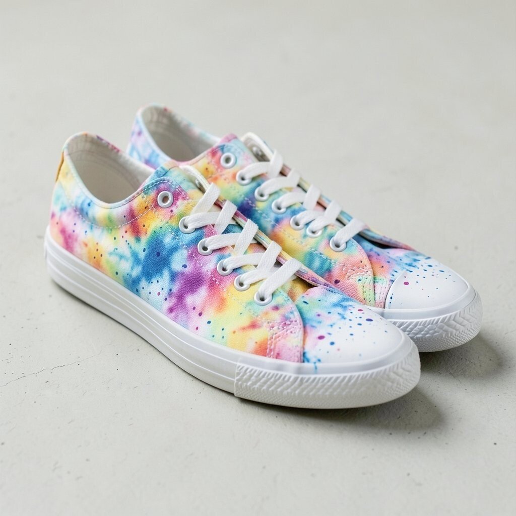 Splatter-dye canvas sneakers use tiny bursts and paint-like dots instead of smooth swirls, which gives them an artsy feel. The pattern looks energetic and a little messy in a good way.