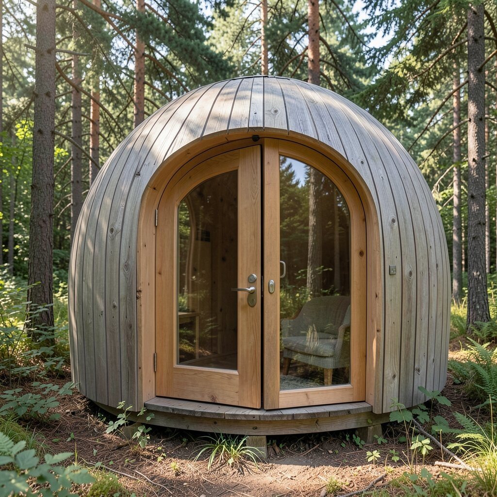 Nestled in a sea of trees, a tiny woodland retreat offers a serene escape from urban noise. The soft, earthy colors of the cabin blend seamlessly with the surroundings.