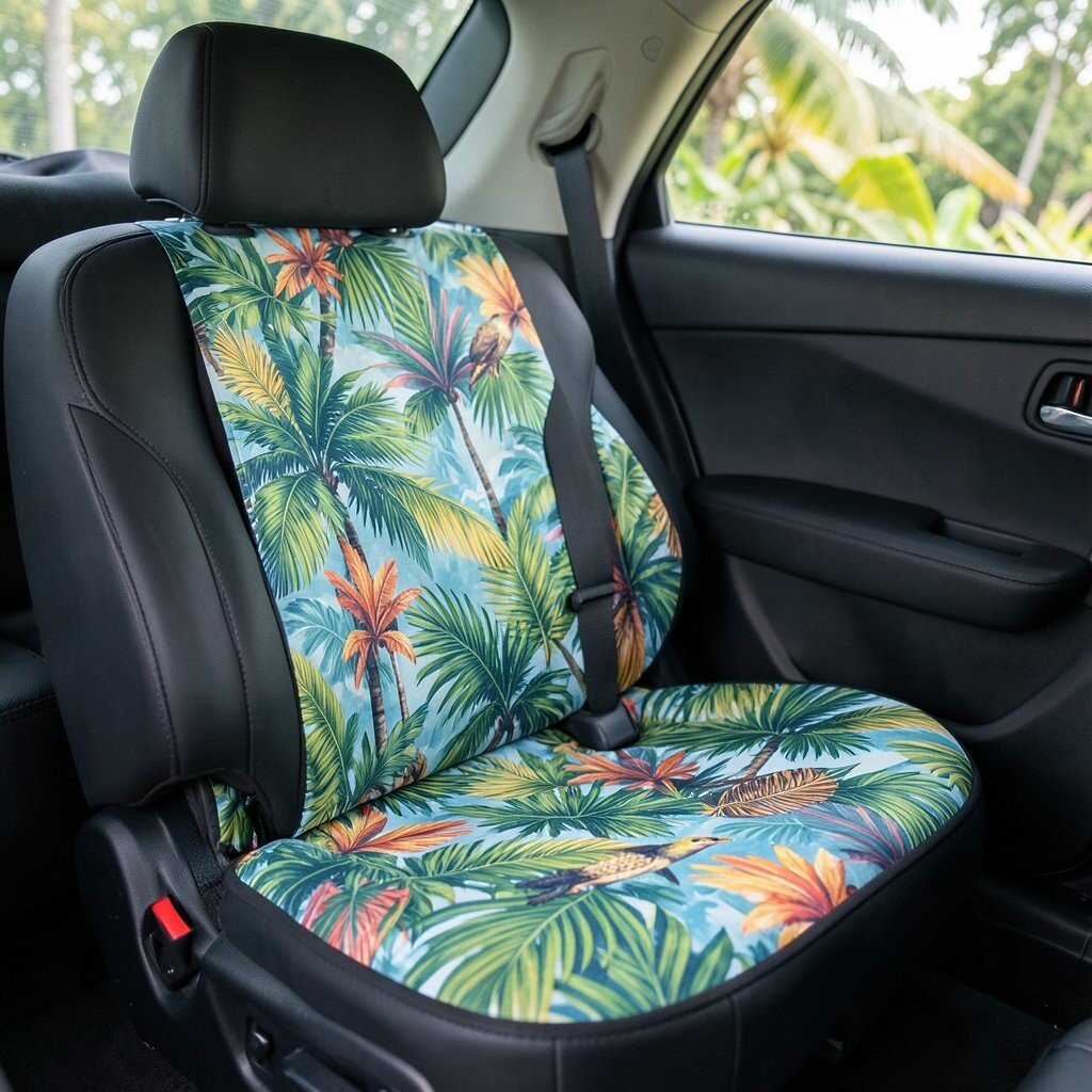 Tropical seat covers bring a bit of paradise to your car. Think palm leaves, vibrant flowers, and ocean blues.
