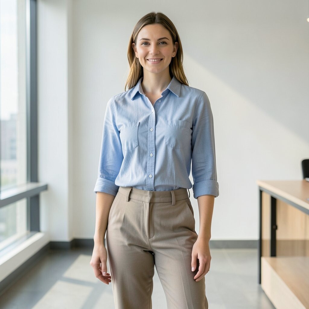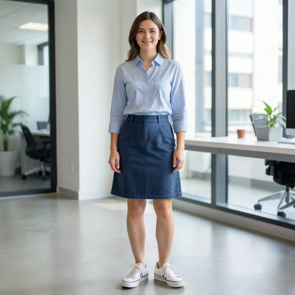 This outfit is a great way to use pieces you may already own. It feels friendly and easy, but it still looks planned. You can wear the shirt tucked in, tied at the waist, or layered under a blazer if your office leans a little dressier.