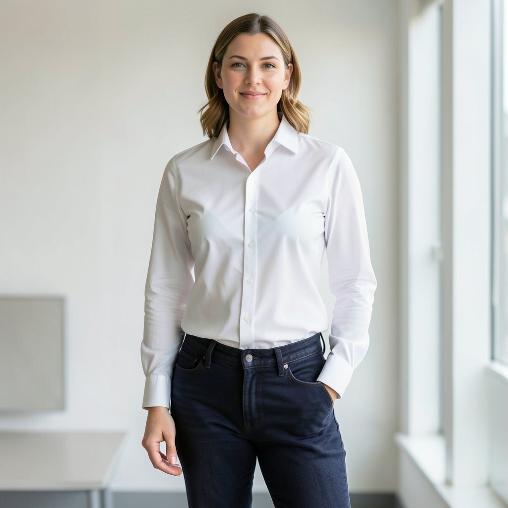 A crisp white shirt with dark jeans creates a clean, sharp look that still feels relaxed. The bright top and deep denim make a strong contrast that looks neat right away.