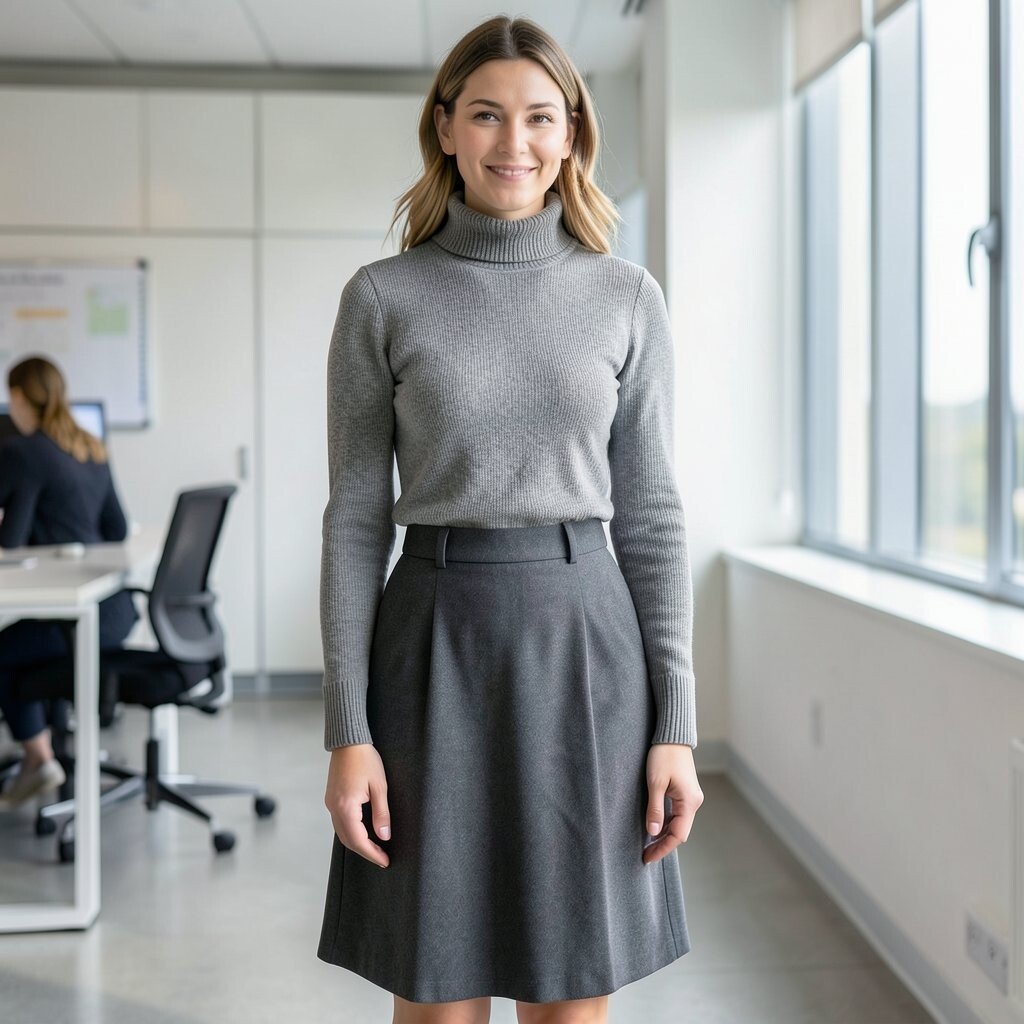 This outfit works well in cooler weather and still looks neat enough for the office. A thin turtleneck can layer nicely under jackets, while a thicker one adds cozy texture. If you want to make it your own, choose a skirt with pleats, buttons, or a soft print.