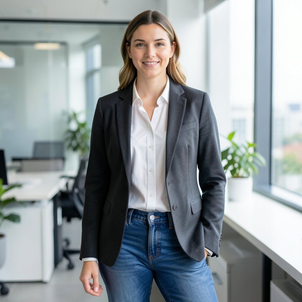 A casual blazer with jeans gives a relaxed office look that still feels smart. The blazer sharpens the outfit, while the jeans keep it easy.