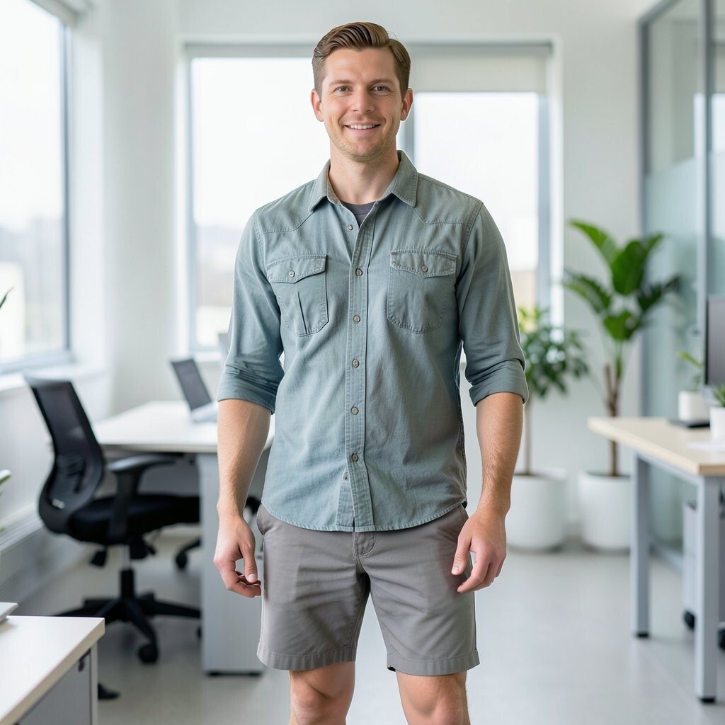 A utility shirt with smart shorts can work in some casual offices, especially in warmer weather. The shirt adds a polished, workwear feel, while the shorts keep things light.