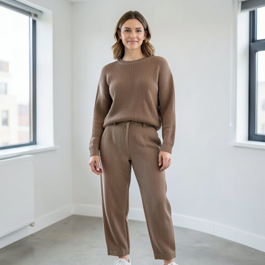 Matching knit pieces create a smooth, comfy outfit that still looks polished. The soft texture makes the look feel warm and easy.