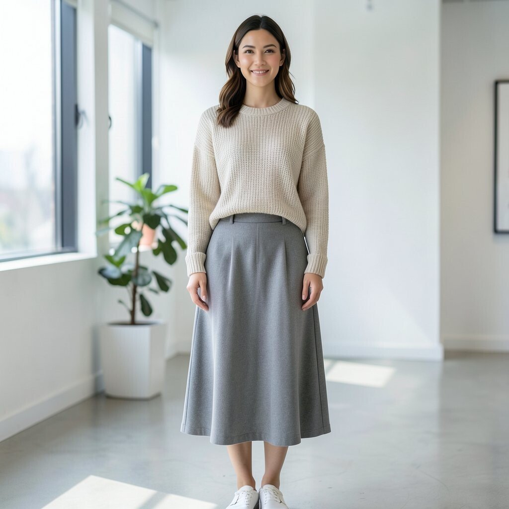 This outfit is useful when you want comfort with a polished edge. A pleated skirt can add movement, while a straight skirt feels more sleek and simple. You can make it your own with flat shoes, ankle boots, or a necklace that sits just right.