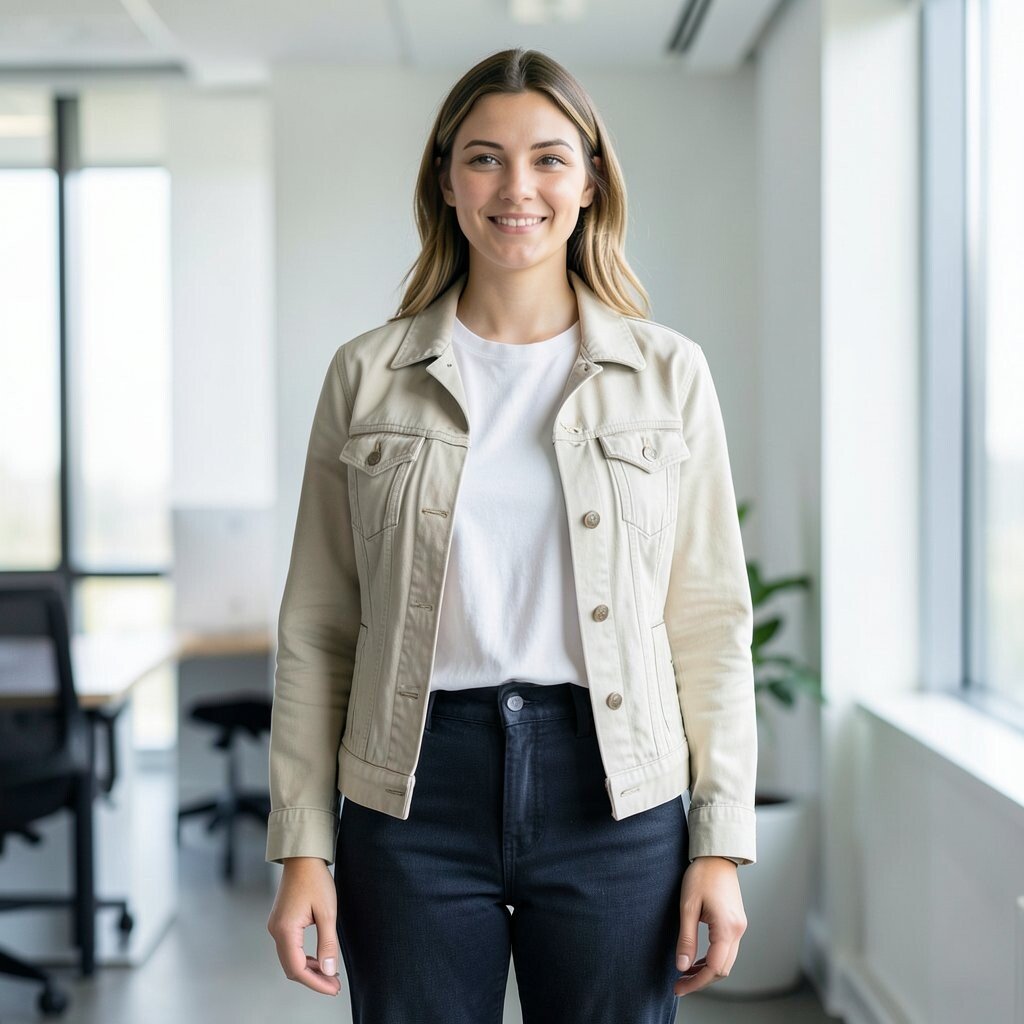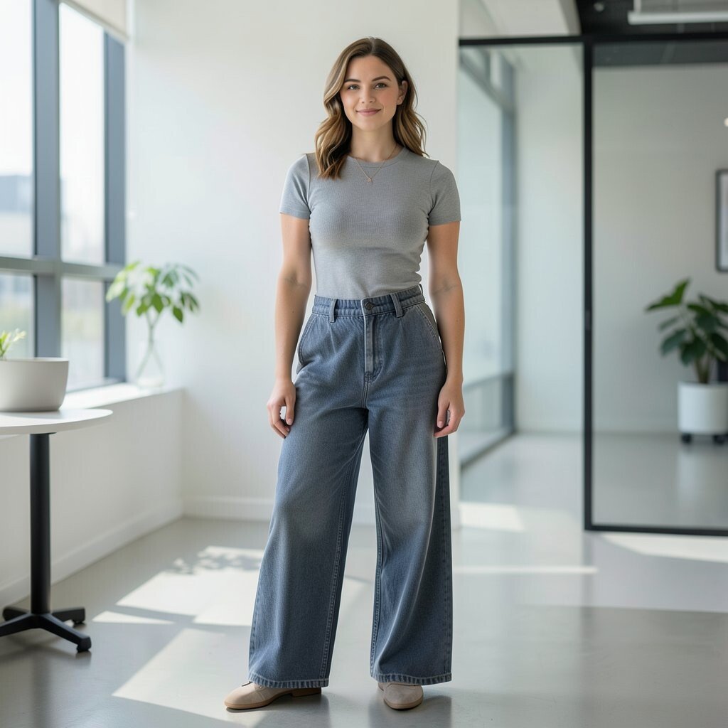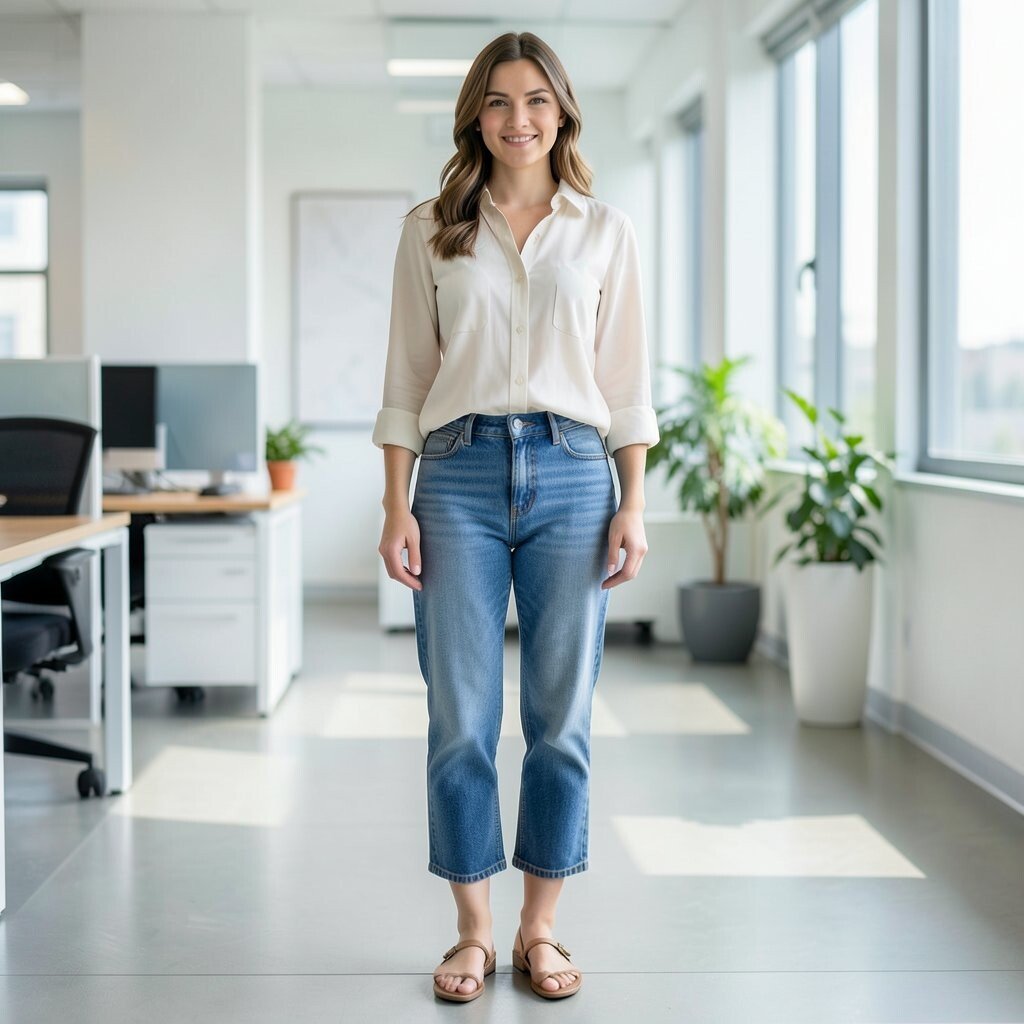 This is a good outfit for offices that like relaxed style but still expect a tidy appearance. Try a blouse with puff sleeves, a tie neck, or a gentle print to add personality. Dark or medium wash jeans usually look more office-ready than faded ones.