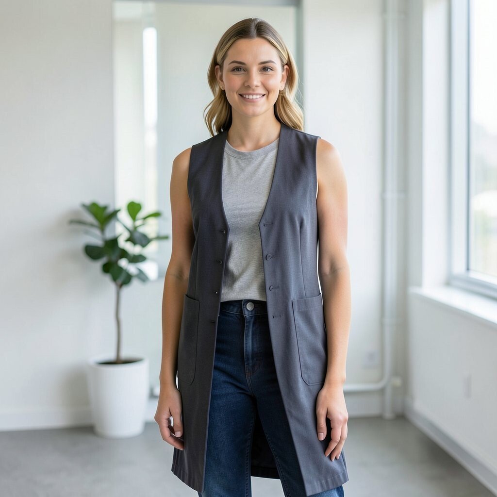 This look is useful when you want something a little different from a plain blouse. A longline vest can make even a simple top feel more styled. You can wear it with trousers, jeans, or a skirt, which makes it a flexible piece for many office days.