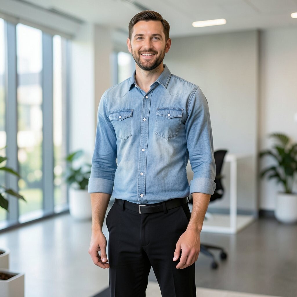 A denim shirt with black trousers gives a casual but tidy office look. The denim adds texture, while the black pants keep it sharp.