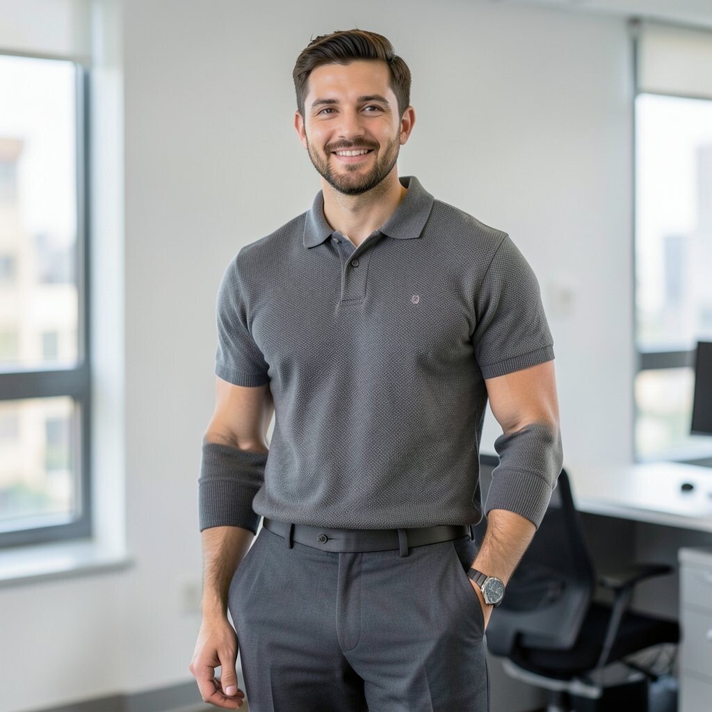 A knit polo gives a smooth, modern feel that looks fresh in an office setting. Paired with tailored trousers, it adds a smart shape without feeling stiff.