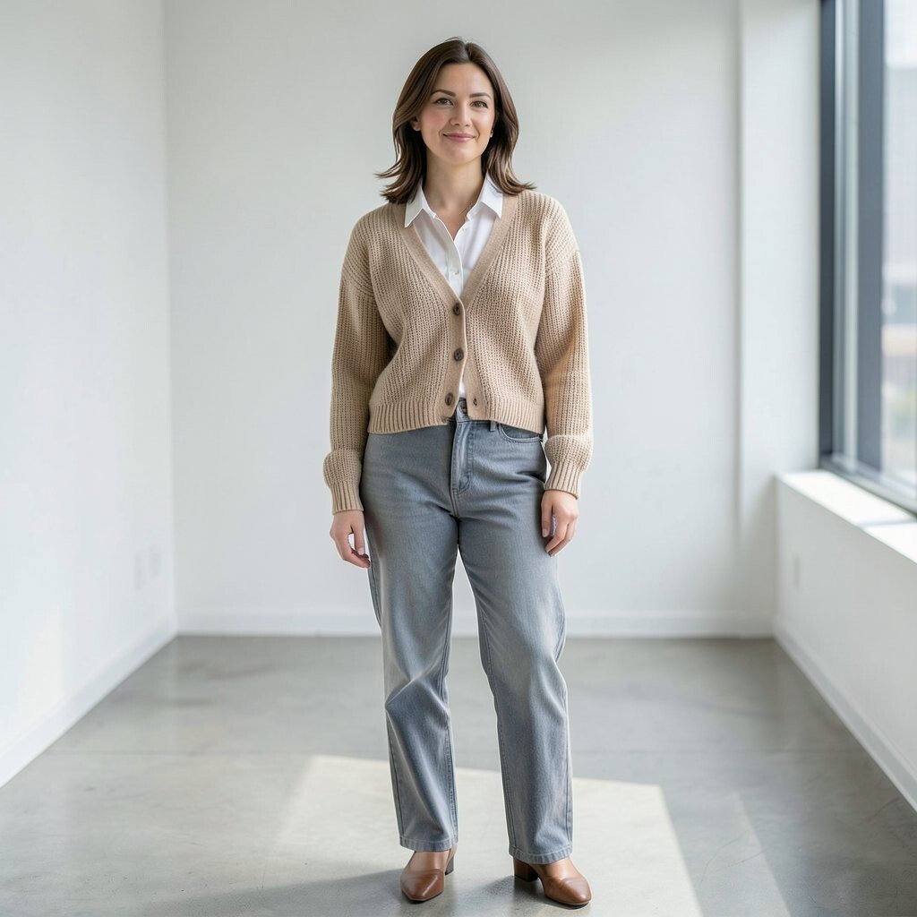 A soft cardigan with straight-leg pants feels calm, neat, and easy to wear. The cardigan adds warmth, and the pants keep the shape clean.