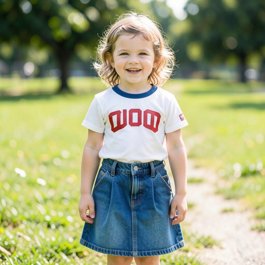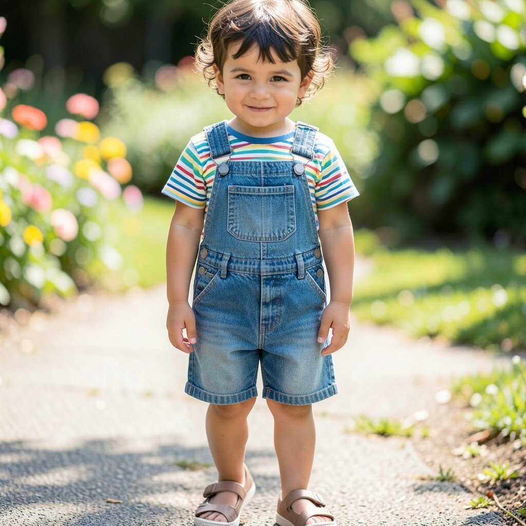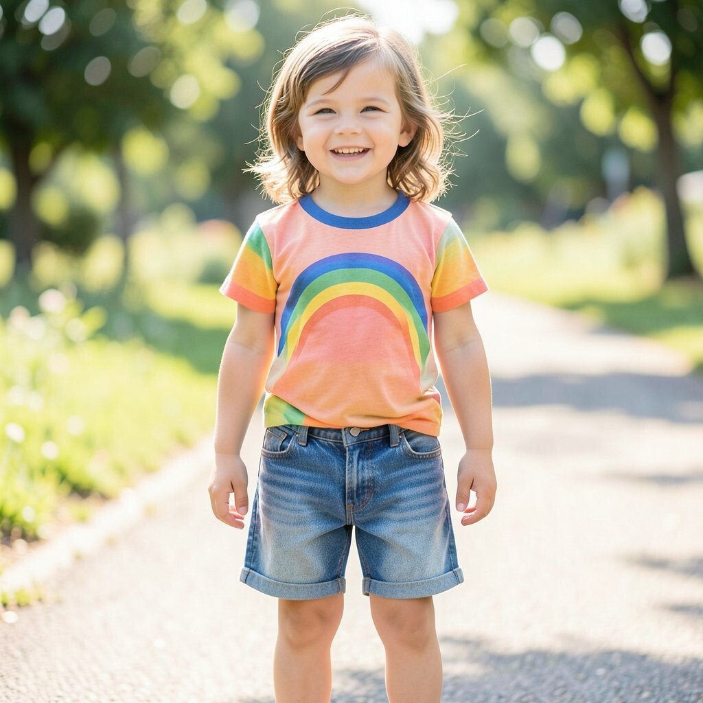 A rainbow T-shirt paired with classic denim shorts is as vibrant as a summer day. This outfit is perfect for any casual outing, from picnics in the park to playing in the backyard.