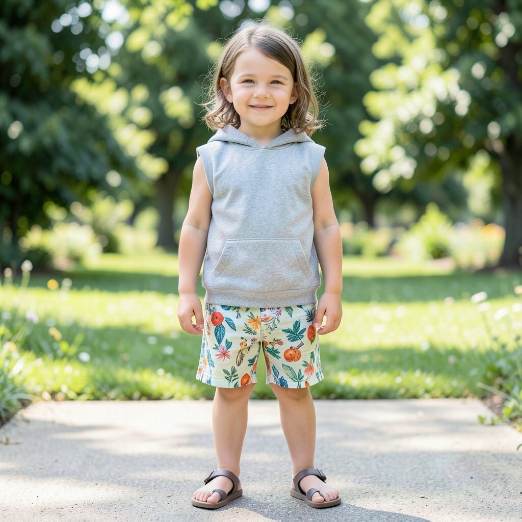 A sleeveless hoodie paired with patterned shorts is a trendy and comfortable option. It’s great for casual outings.