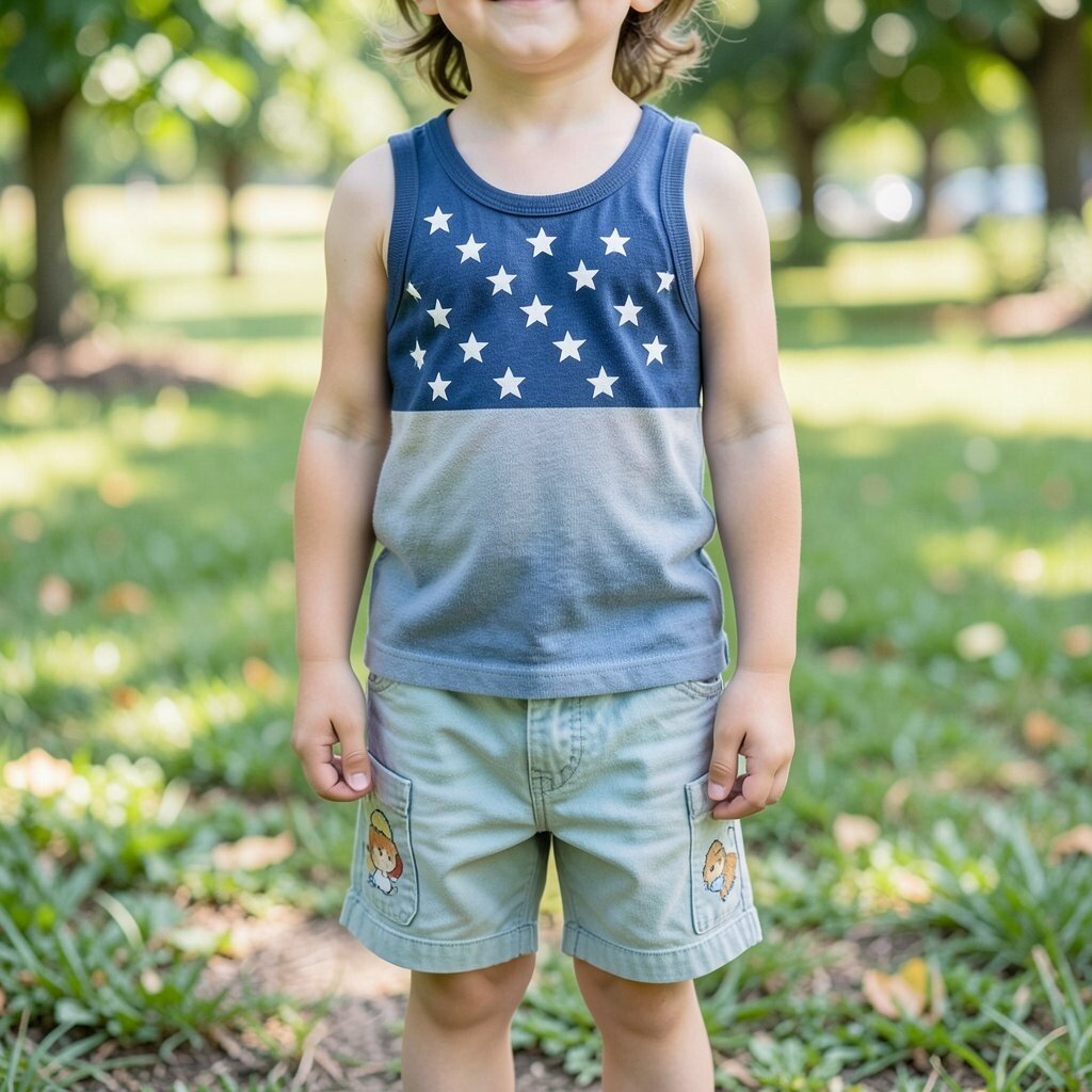 The stars and stripes create a festive look, while the shorts keep it casual. This outfit is both fun and symbolic.