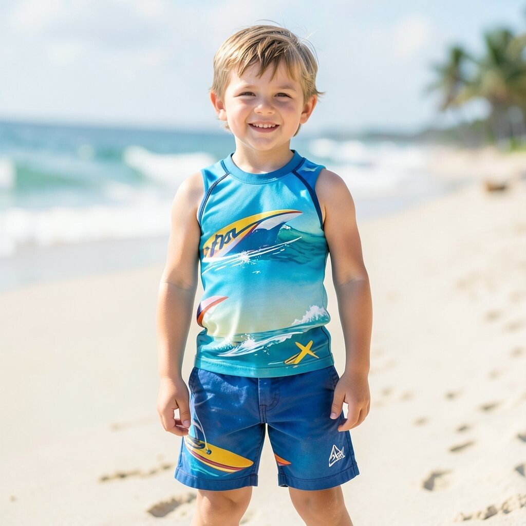 For water-loving kids, a surf-themed rash guard with board shorts is a must-have. It’s perfect for splashing around.