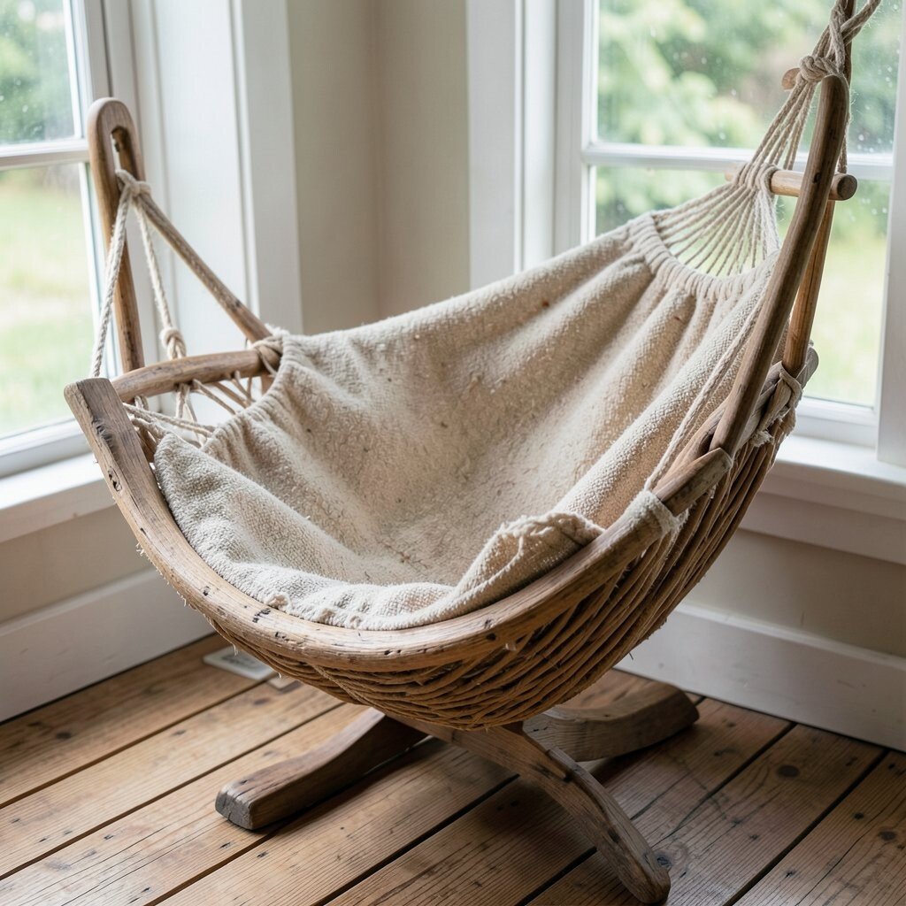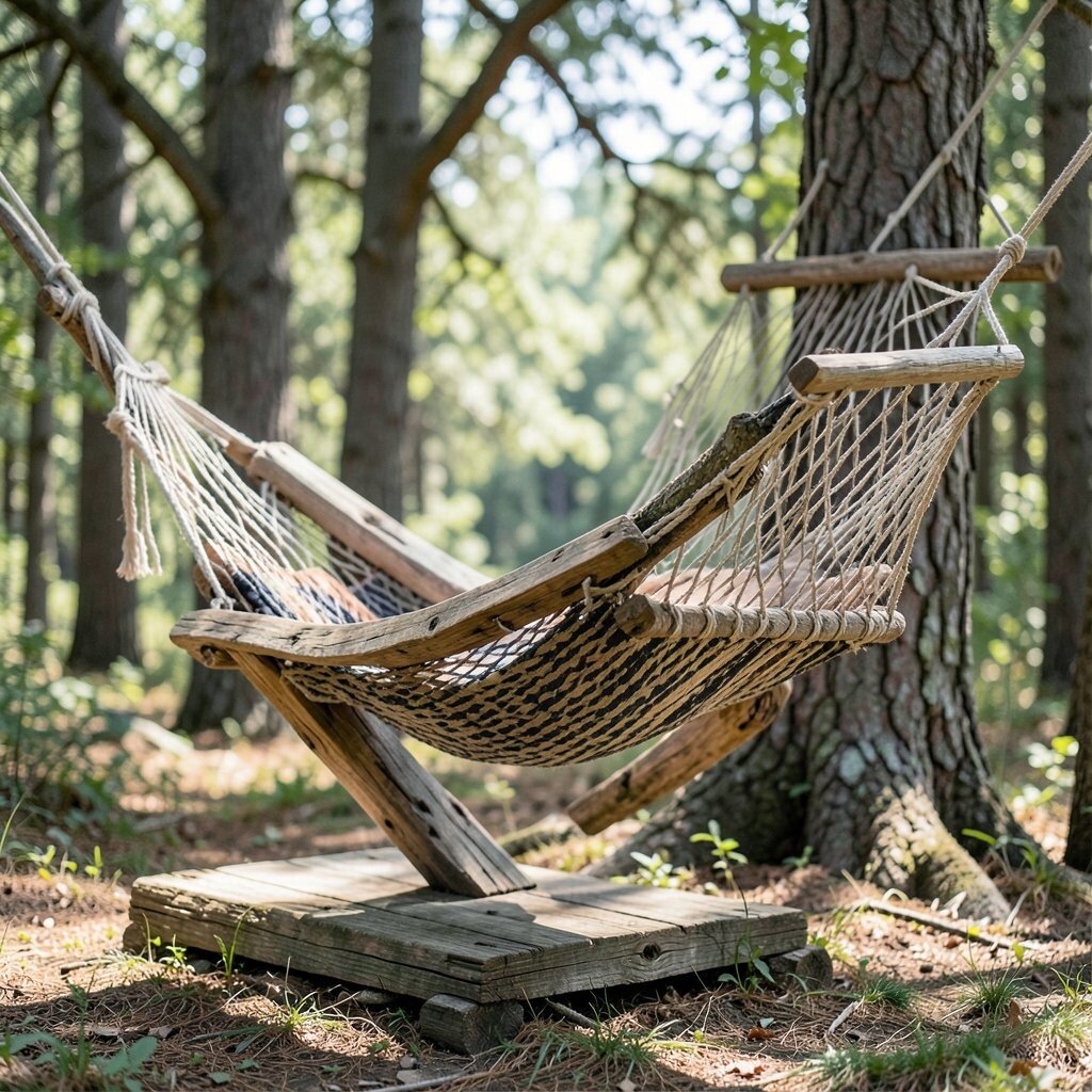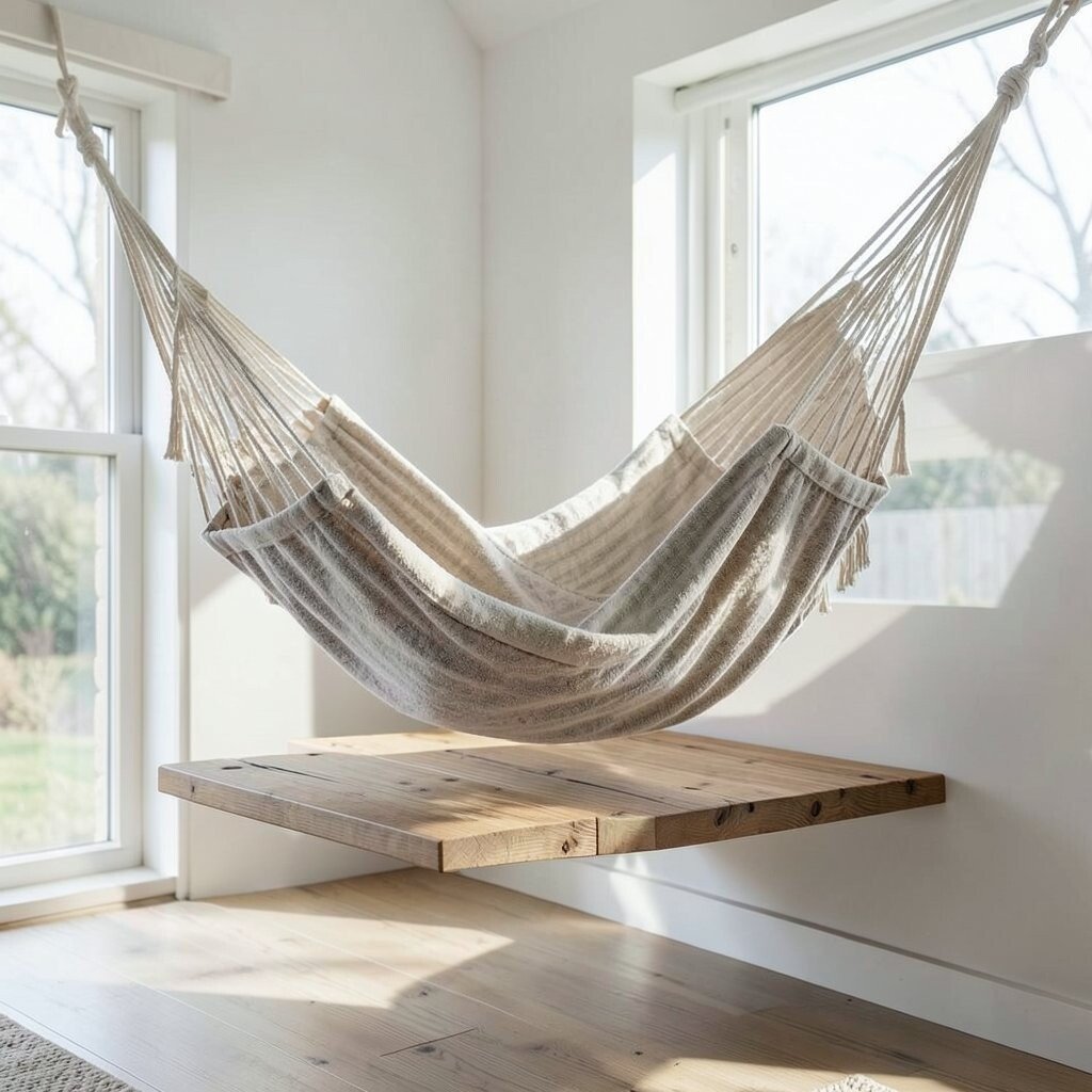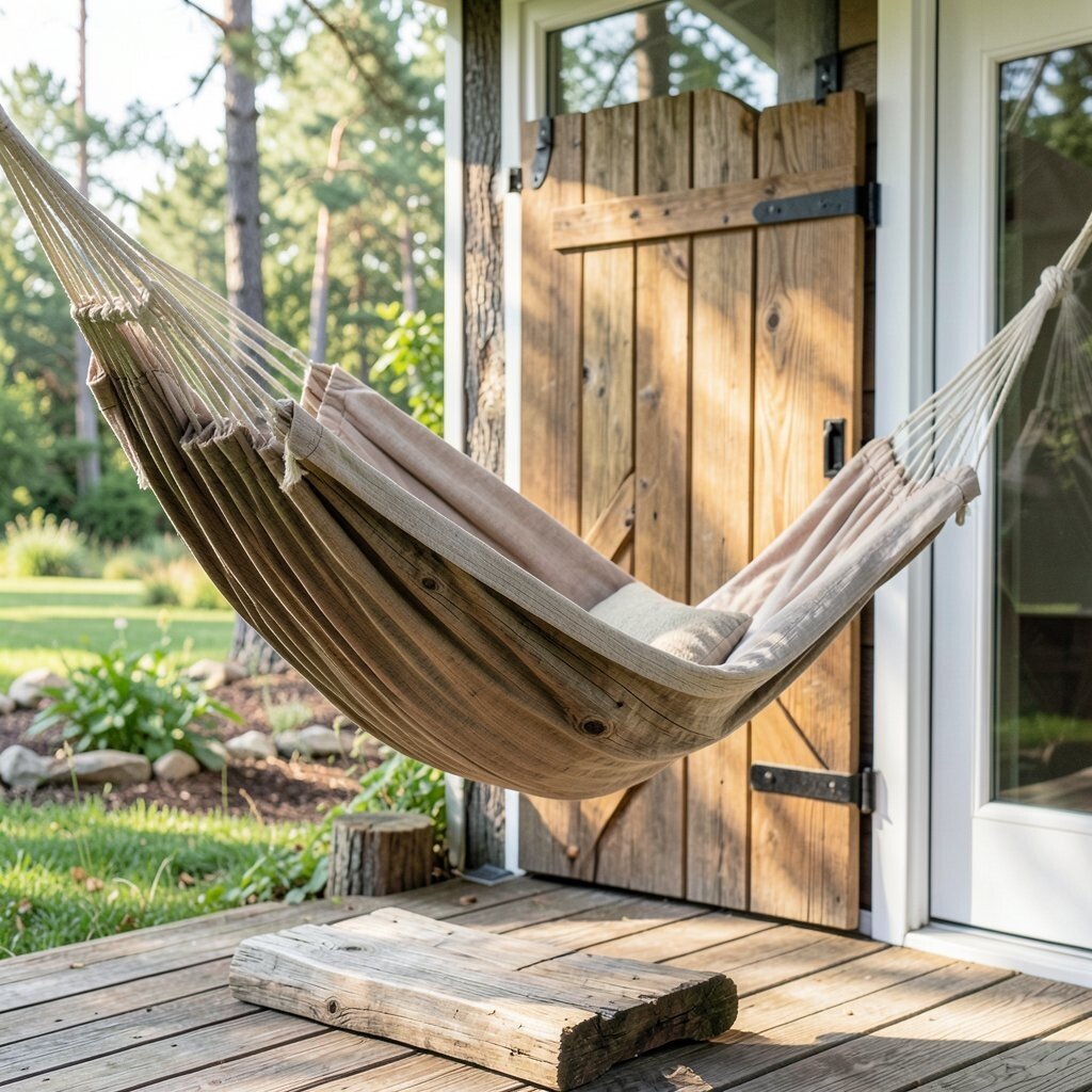 Rustic Barnwood Hammock Picture a hammock made from weathered barnwood, giving it a rustic charm. It’s perfect for a cozy corner in your living room.