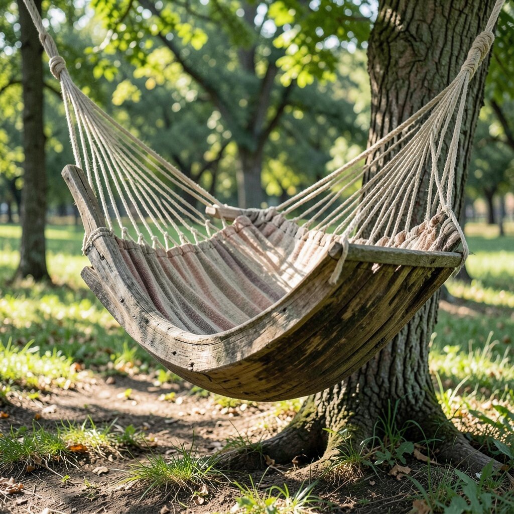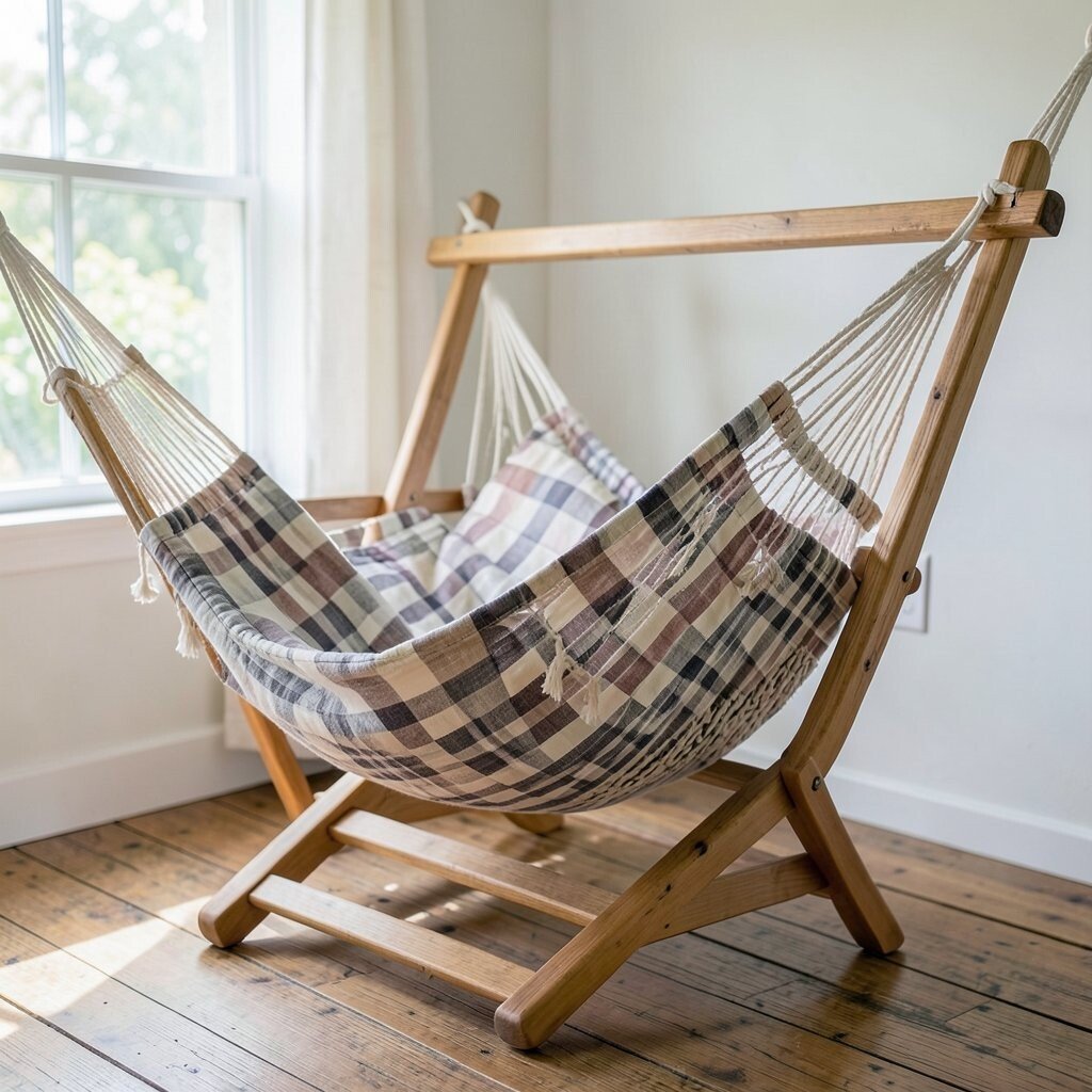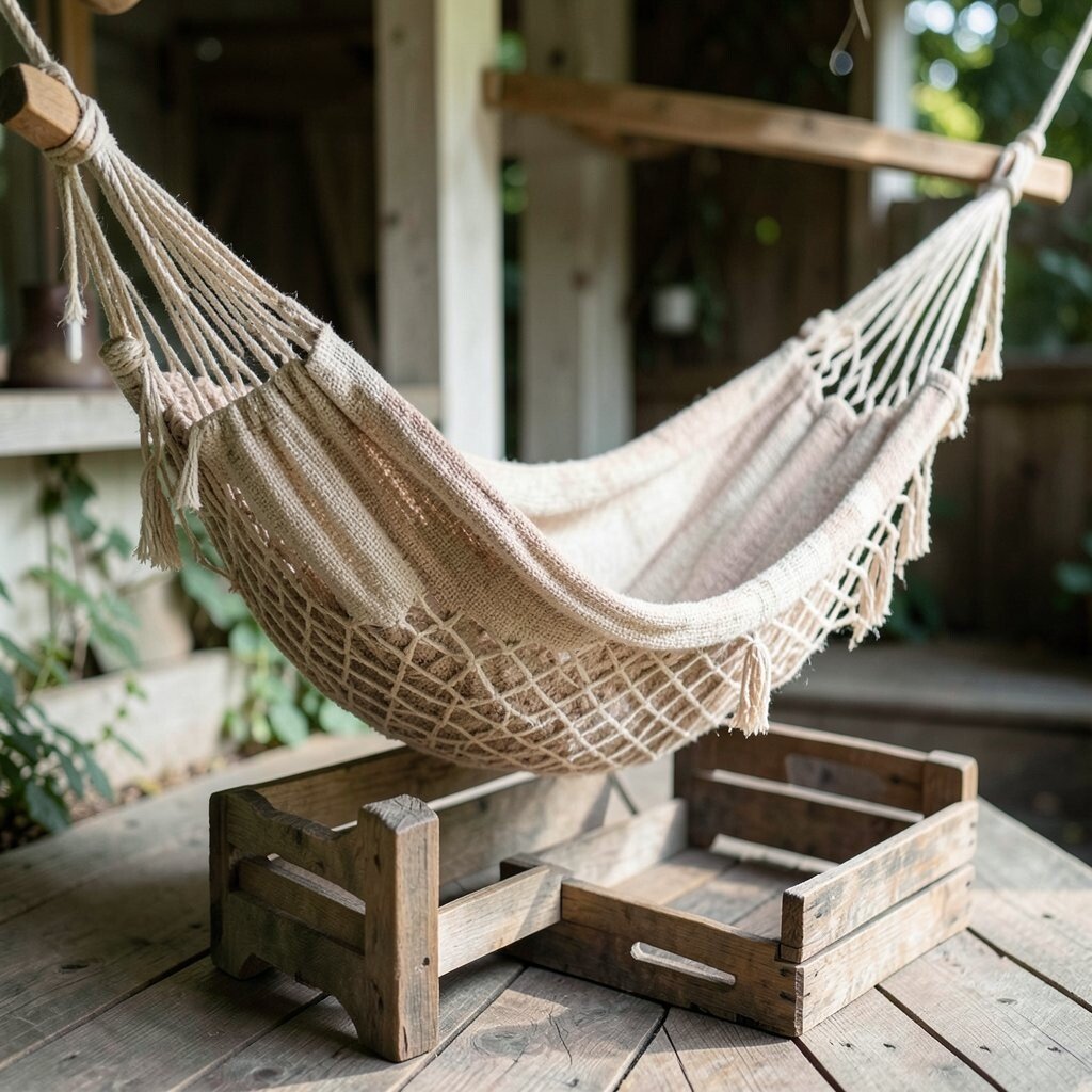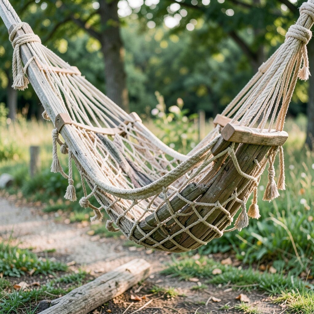 Rustic Barnwood Hammock Picture a hammock made from weathered barnwood, giving it a rustic charm. It’s perfect for a cozy corner in your living room.