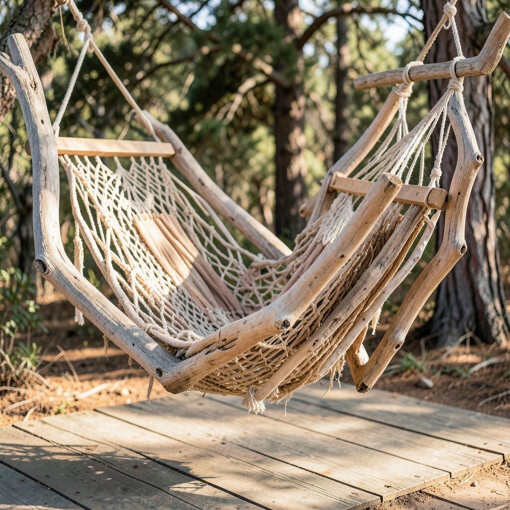 Bohemian Driftwood Hammock Use driftwood to craft a hammock that brings a bit of the beach indoors. Each piece of driftwood is unique, adding to the hammock’s charm.