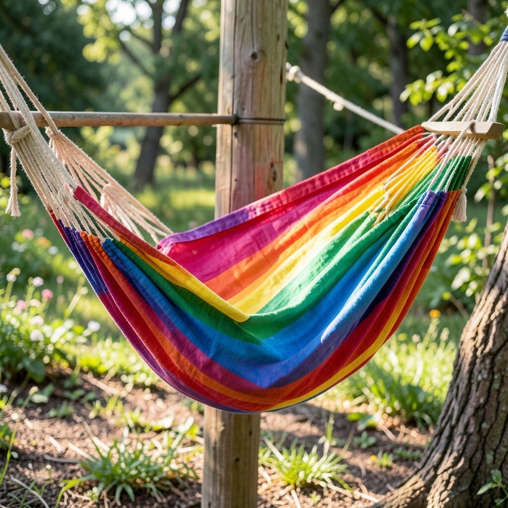 Painted Rainbow Hammock Create a vibrant hammock by painting wooden planks in rainbow colors. It’s a cheerful addition to any home.