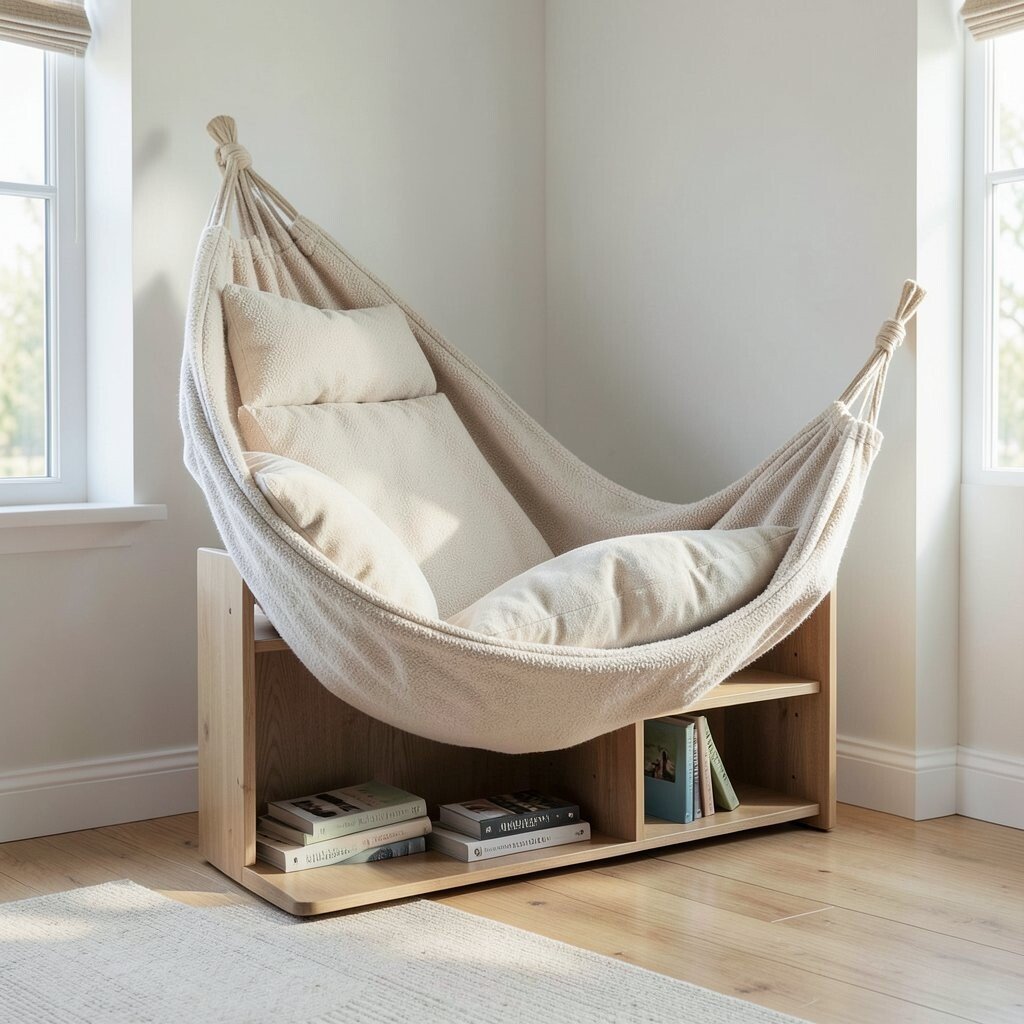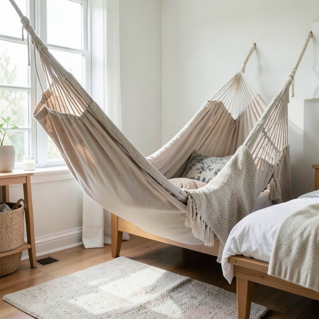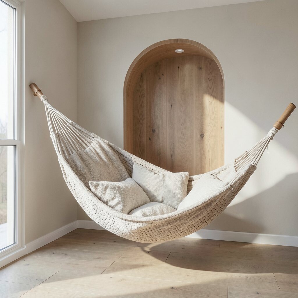 Hang a triangular or custom-shaped hammock that fits snugly. Add a little plant next to it to make it even more inviting.