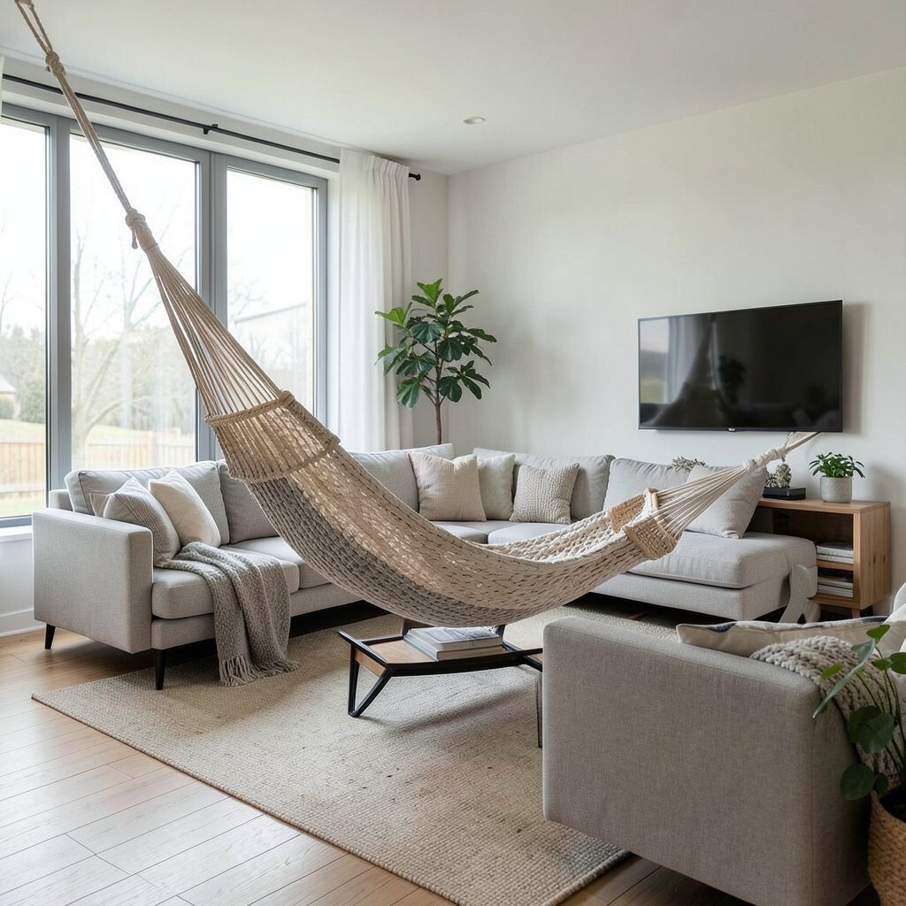 Living Room Lounge Place a cat hammock in the living room, where your cat can be part of the family hangout. It’s a cozy spot to nap while you relax.