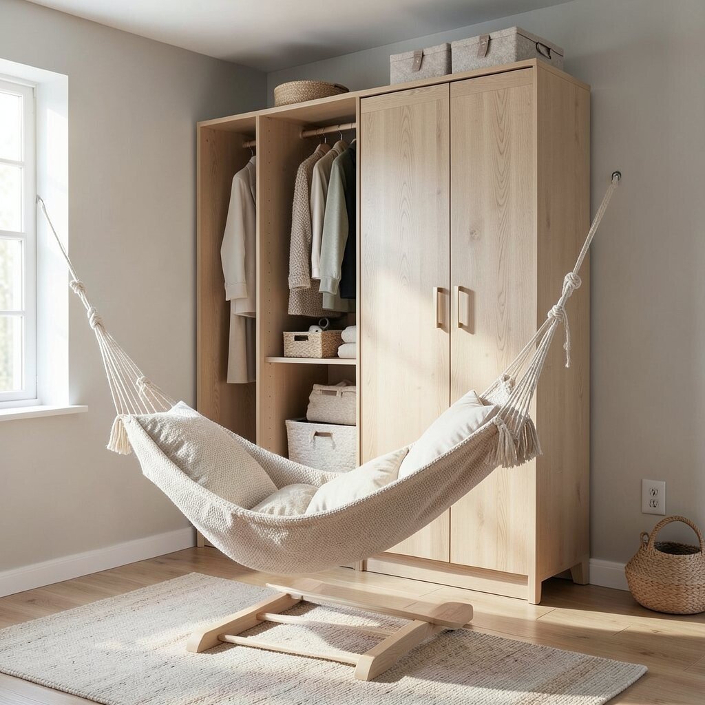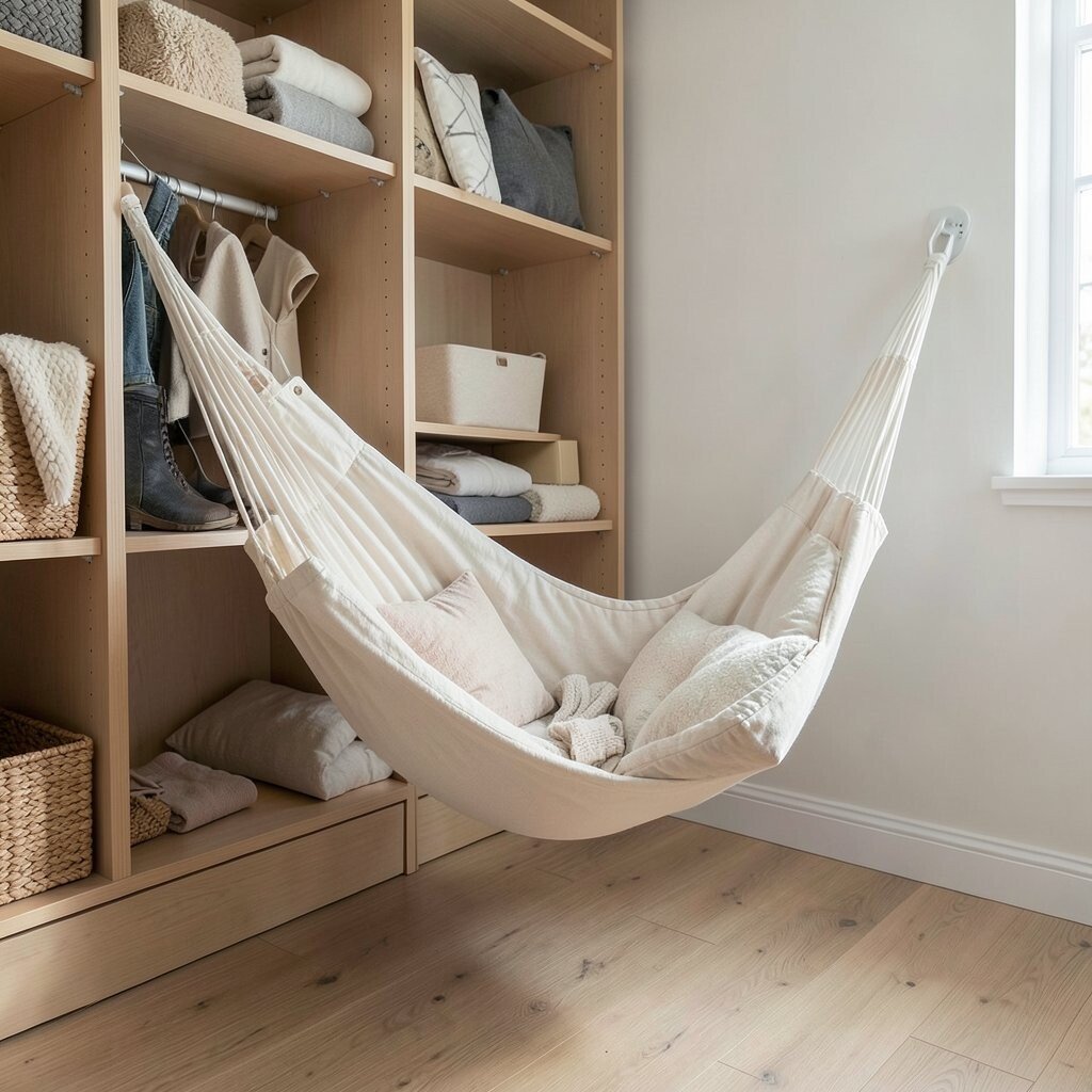 Wardrobe Wonder Install a hammock inside your wardrobe for a hidden napping spot. It’s a fun surprise for your cat and keeps things tidy.