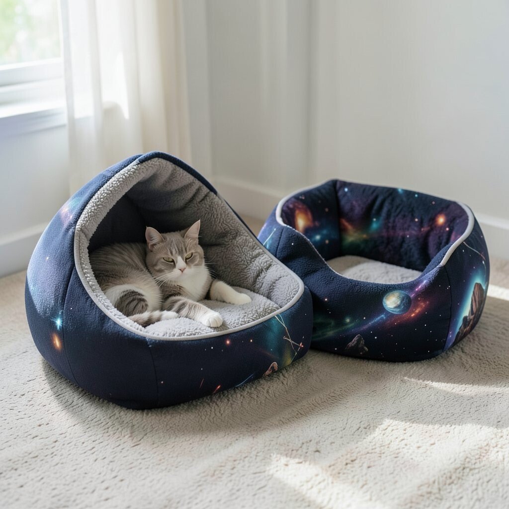 Blast off into comfort with the Galactic Adventurer Bed. Its starry fabric and spaceship shape spark your cat’s imagination. This bed is out of this world for space-loving kitties.