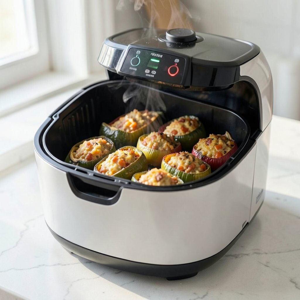 Fill the peppers with your choice of rice, beans, and spices before air frying. This creates a tender pepper with a flavorful filling.