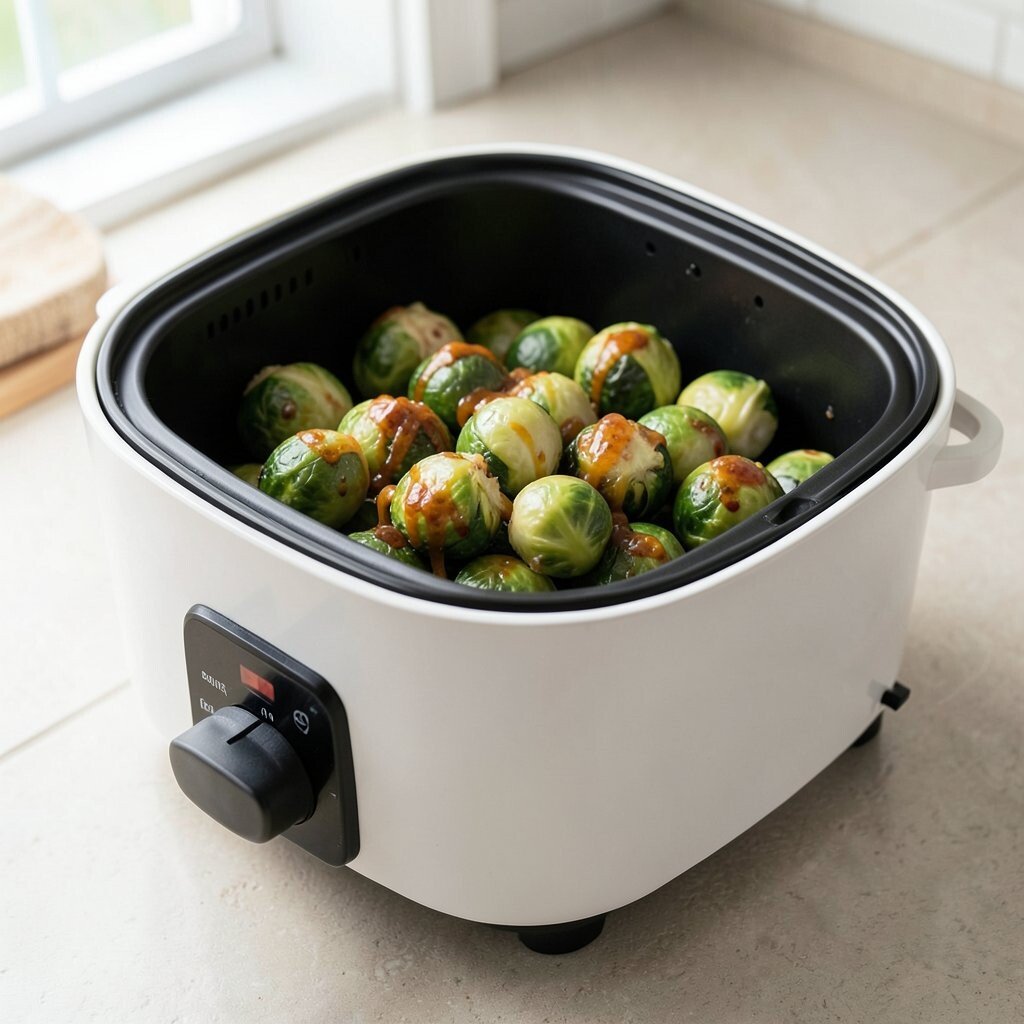 Coat the sprouts in the sauce before air frying to achieve a crispy exterior. This dish is perfect as a side or a main for those looking for something different.