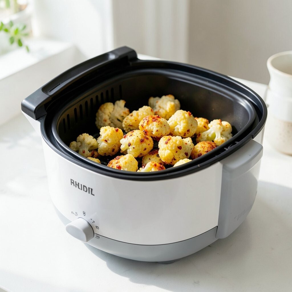 The cauliflower is coated in a spicy buffalo sauce before being air-fried. This creates a crispy exterior with a tender inside.